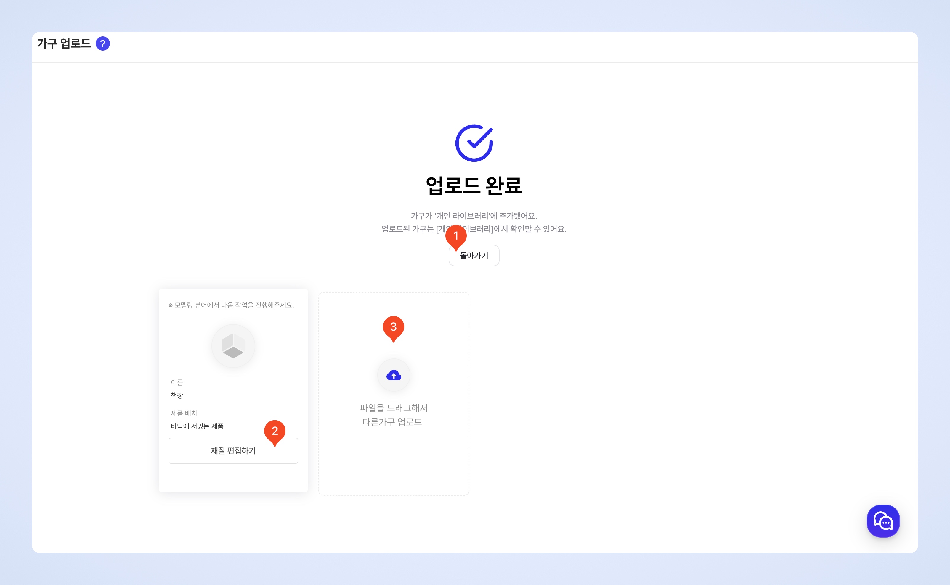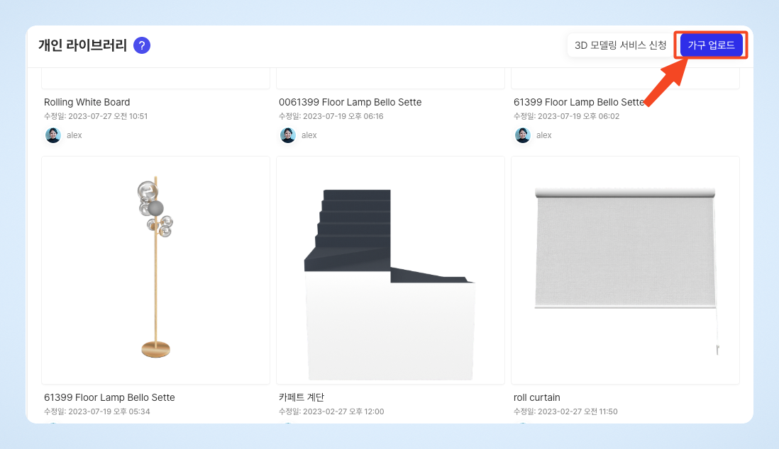 [개인 라이브러리 → 가구 업로드]를 클릭하여 파일을 선택해 주세요.
