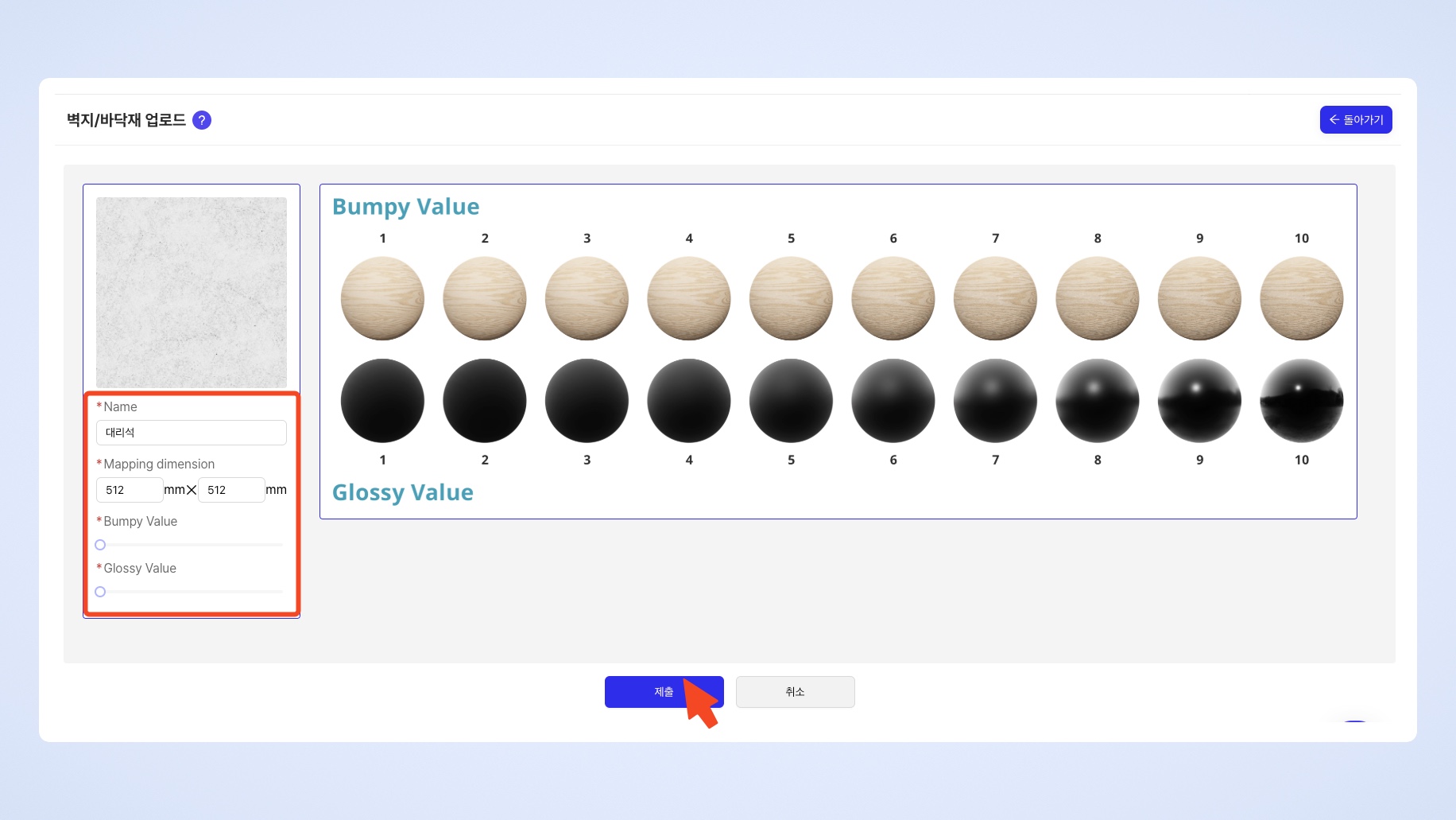 [제출] 버튼을 눌러 주세요.버튼을 누르면 바로 업로드가 완료되며, 벽지/마감재 탭의 메인 화면으로 이동됩니다.