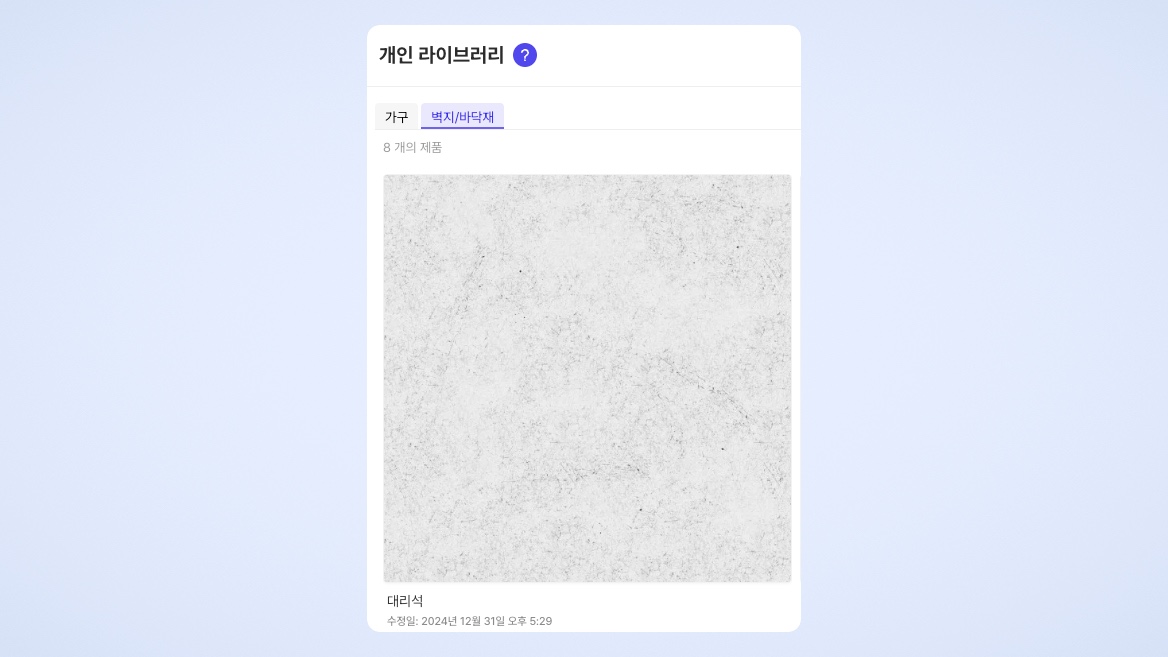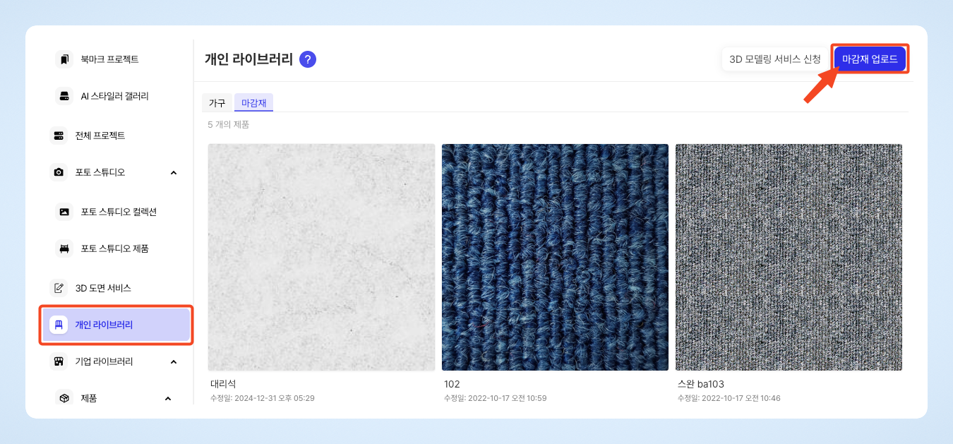 개인 라이브러리 > 마감재 업로드 클릭합니다.
