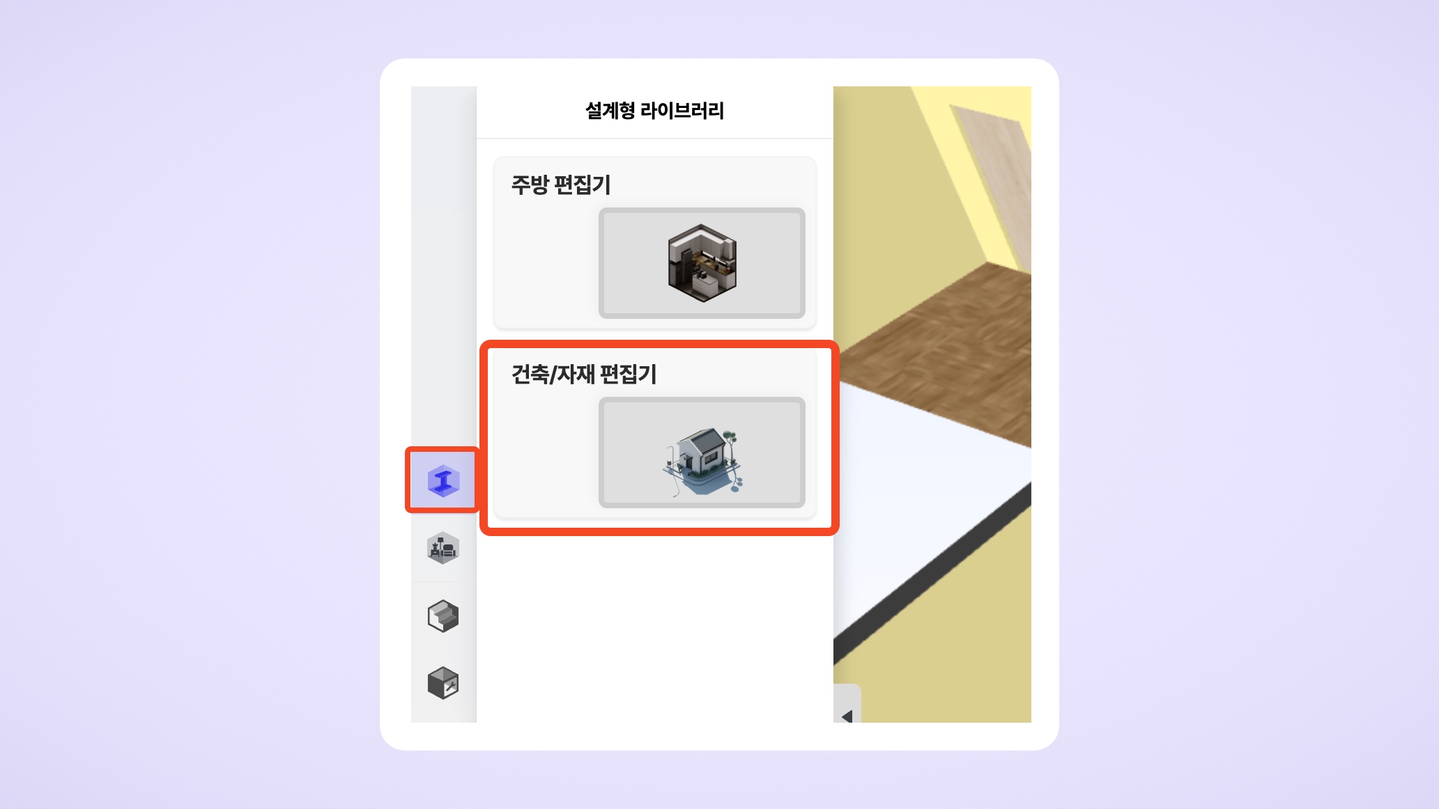 좌측 패널에서 [설계형 라이브러리 → 건축/자재 편집기] 를 통해서 진입해 주세요.