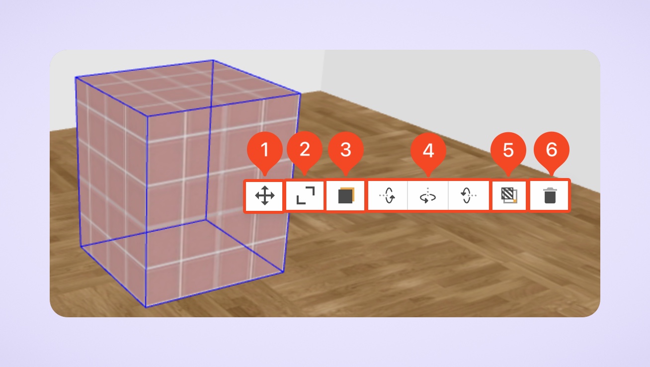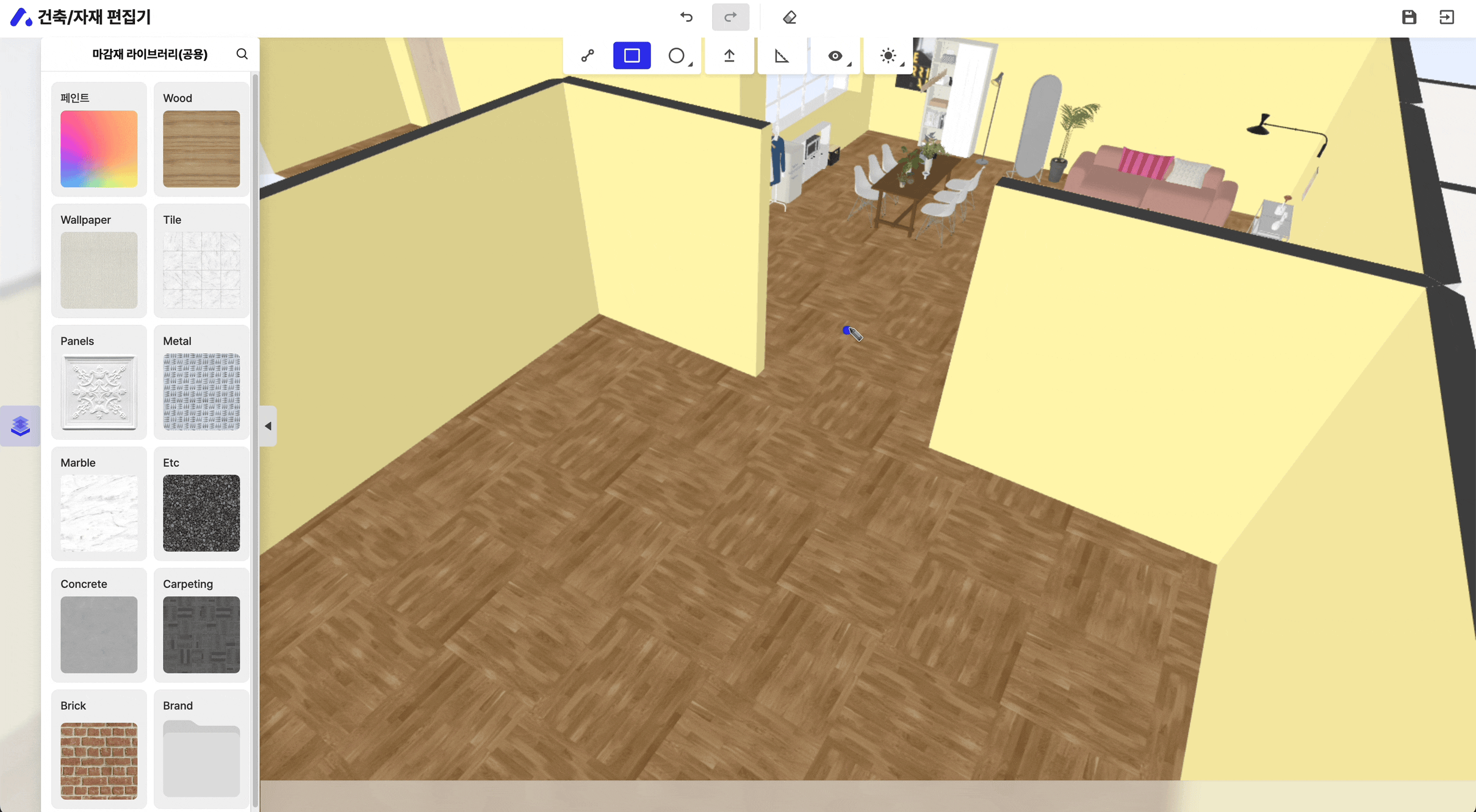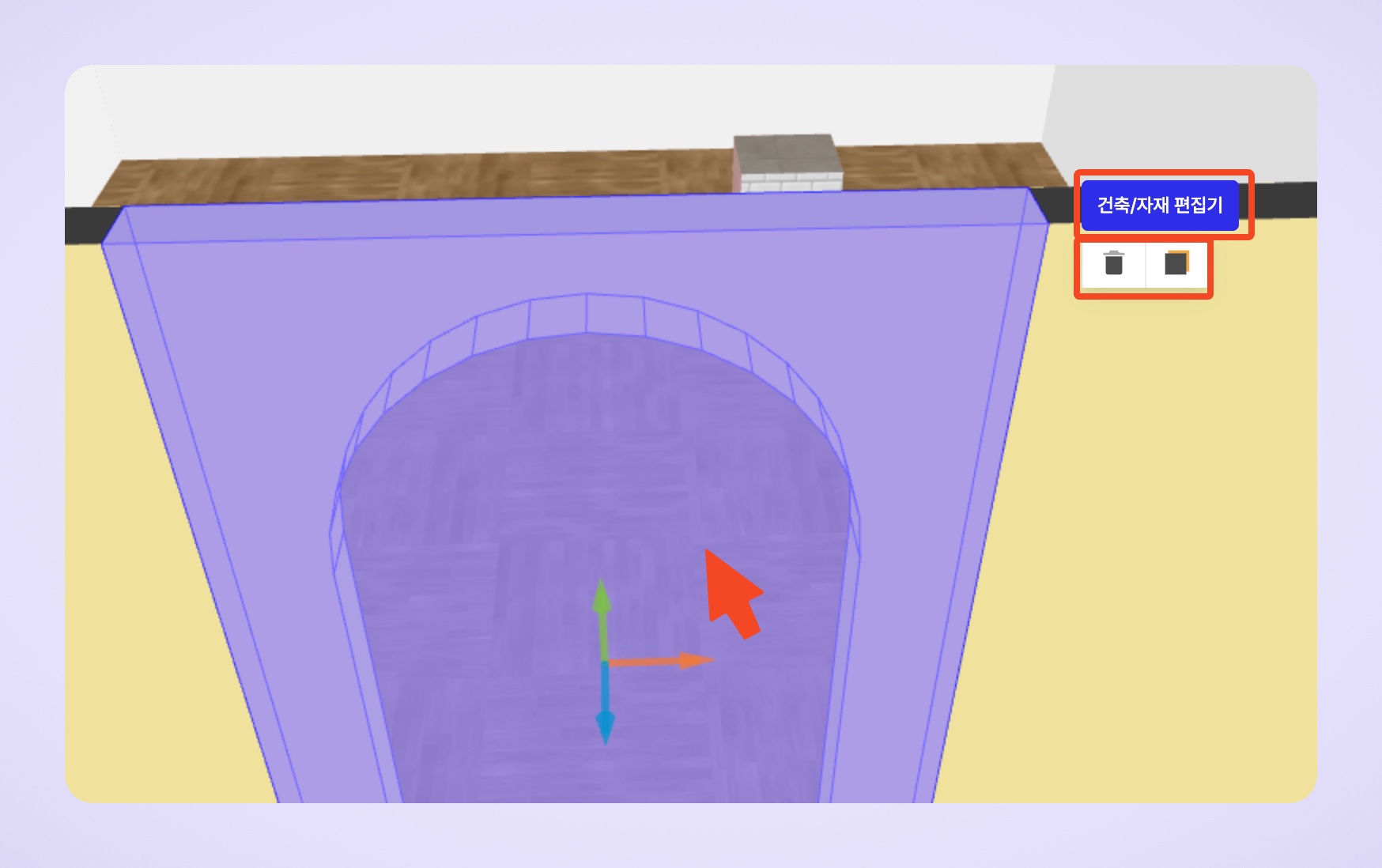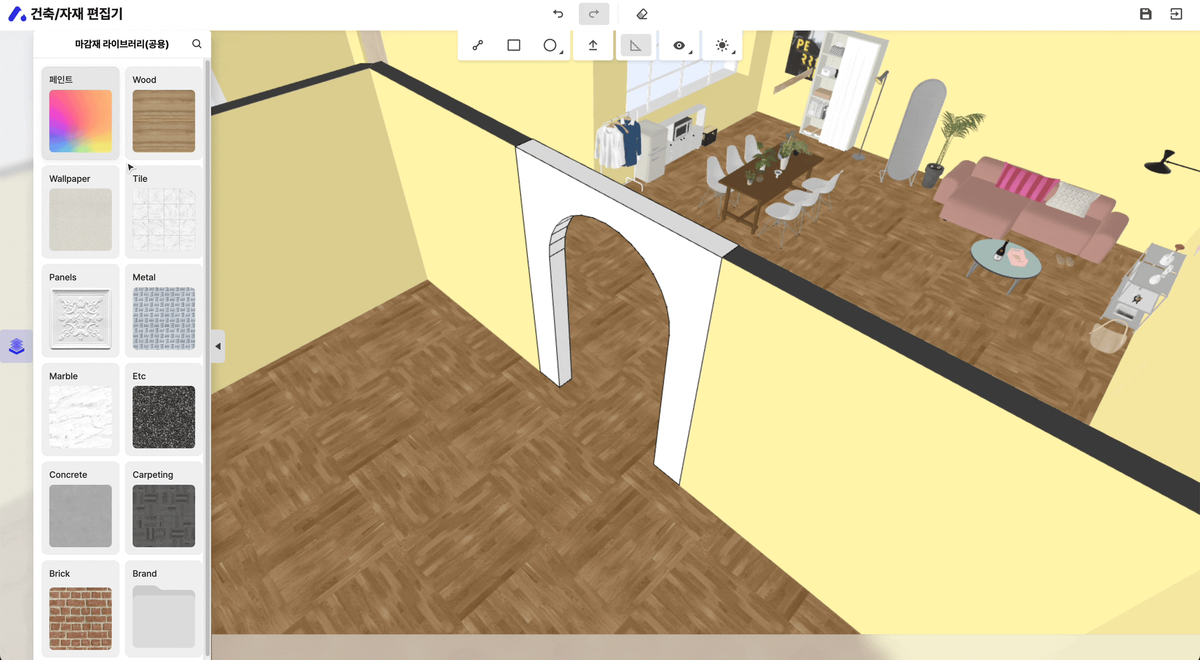 건축/자재 편집기는 간단한 구조물을 3D로 모델링할 수 있는 공간입니다.박스 형태, 원기둥 형태의 기둥, 테이블, 아치 벽 등을 만들 수 있으며, 가구 라이브러리 제품만 사용하는 것이 아니라, 사용자가 원하는 모양을 직접 만들어 공간을 자유롭게 연출할 수 있습니다.