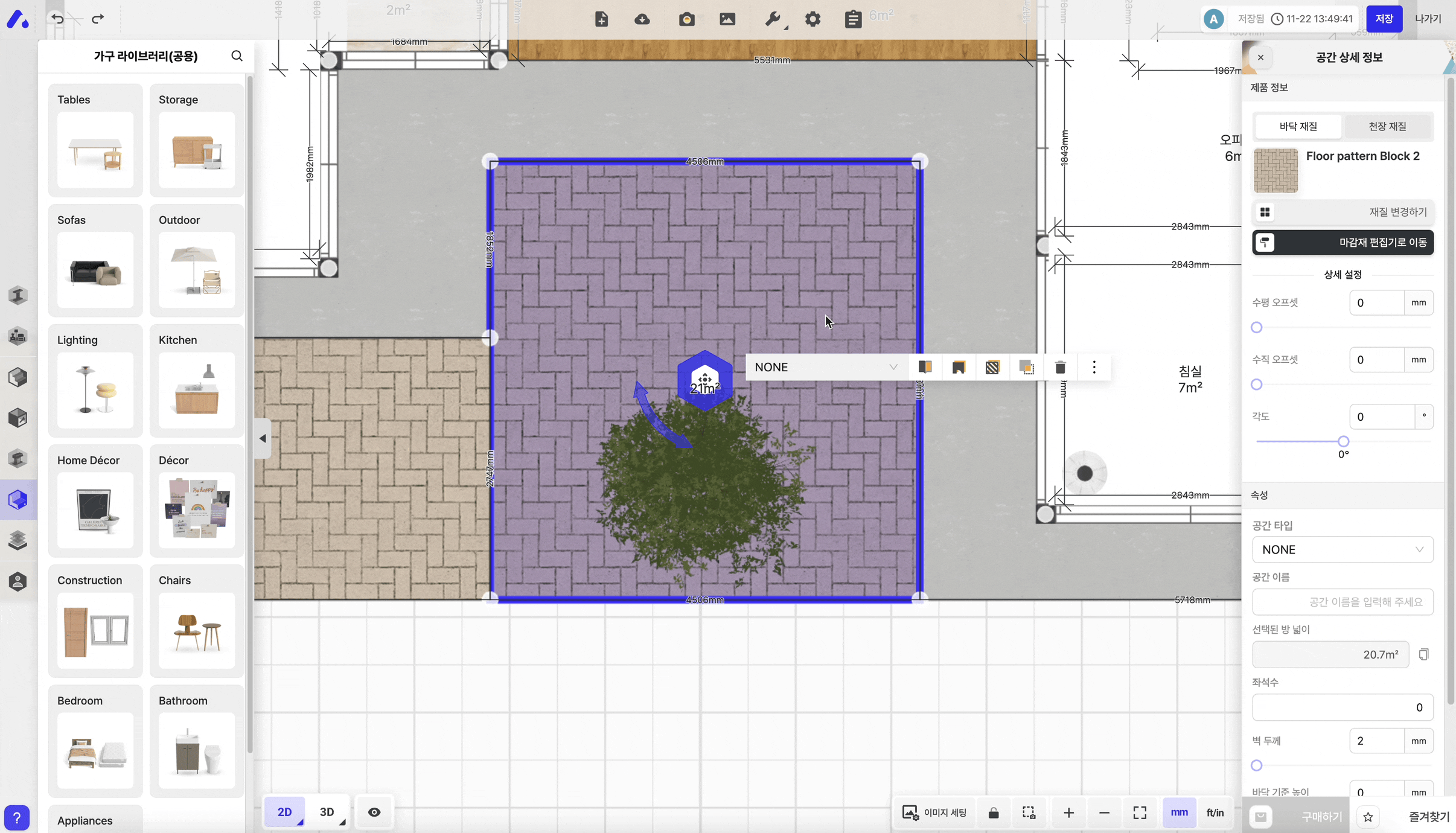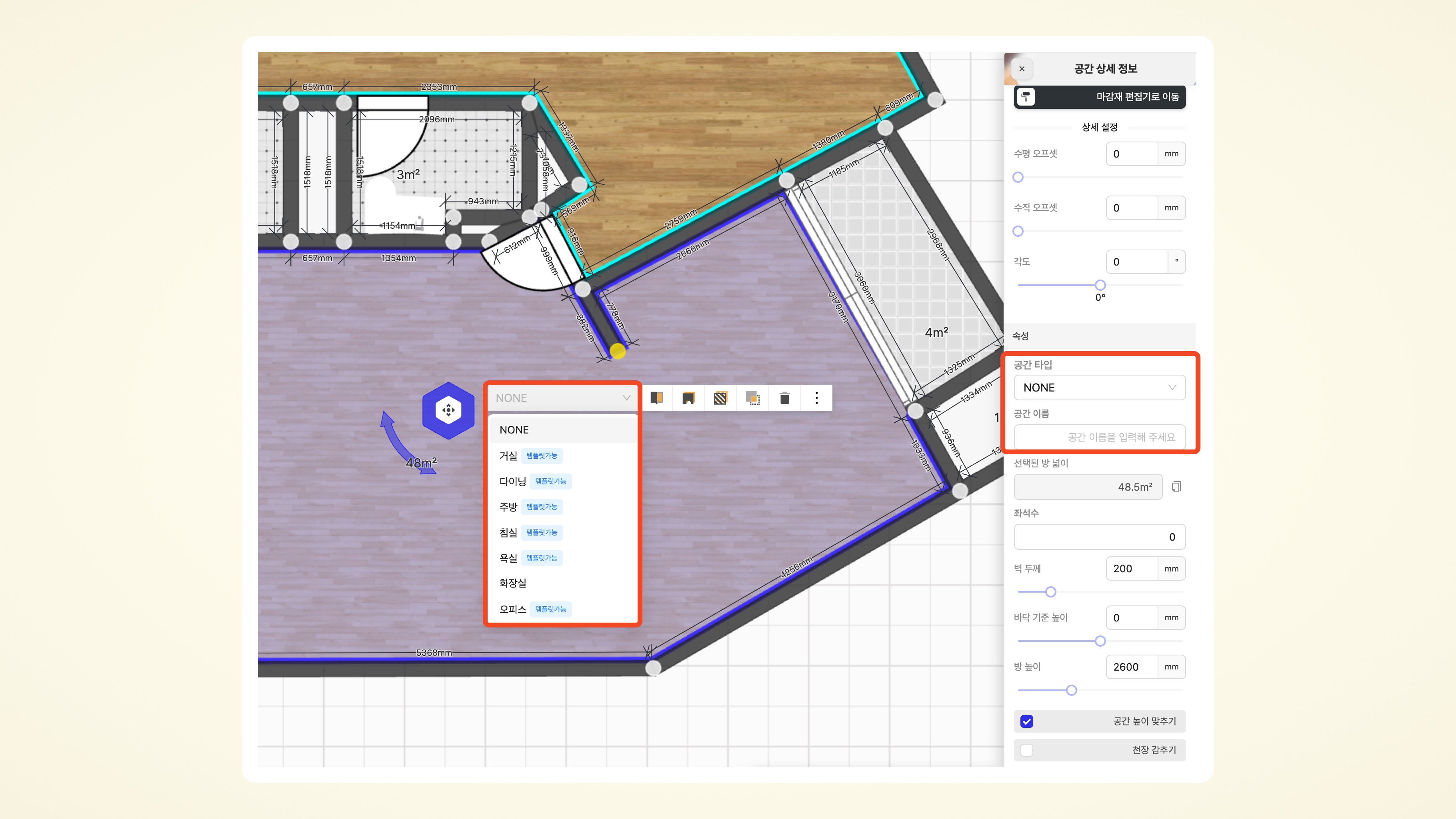 2D 모드에서 바닥을 클릭하면 [공간 타입]을 지정할 수 있습니다. 툴바에서 토글을 열어 바로 설정하거나, 우측의 공간 상세 정보에서 공간 타입을 설정할 수도 있어요. 만약 나만의 특별한 이름을 공간에 추가하고 싶다면, [공간 이름]란에 직접 입력하여 설정할 수 있습니다.