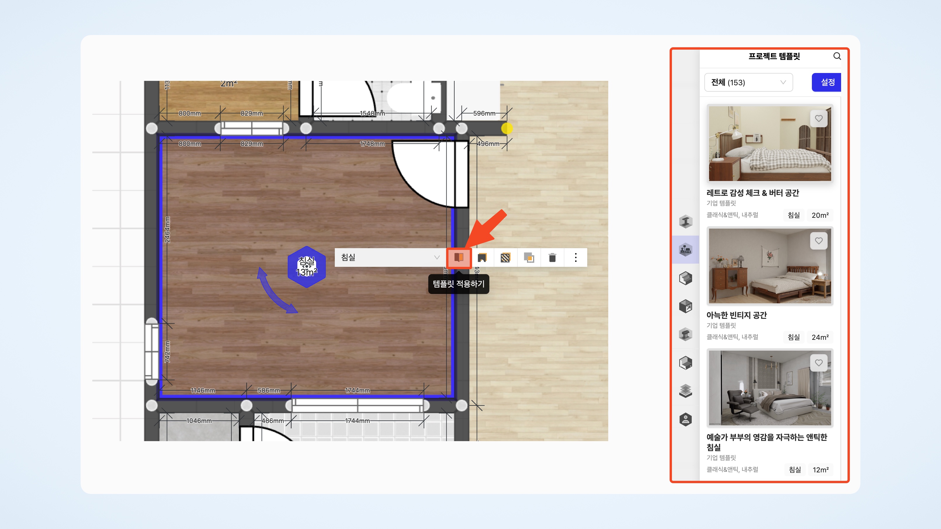 템플릿 기능을 통해 손쉽게 시작해보세요! 미리 준비된 다양한 인테리어 템플릿을 활용하면, 원하는 스타일을 빠르게 적용하고 아이디어를 얻을 수 있습니다 😎