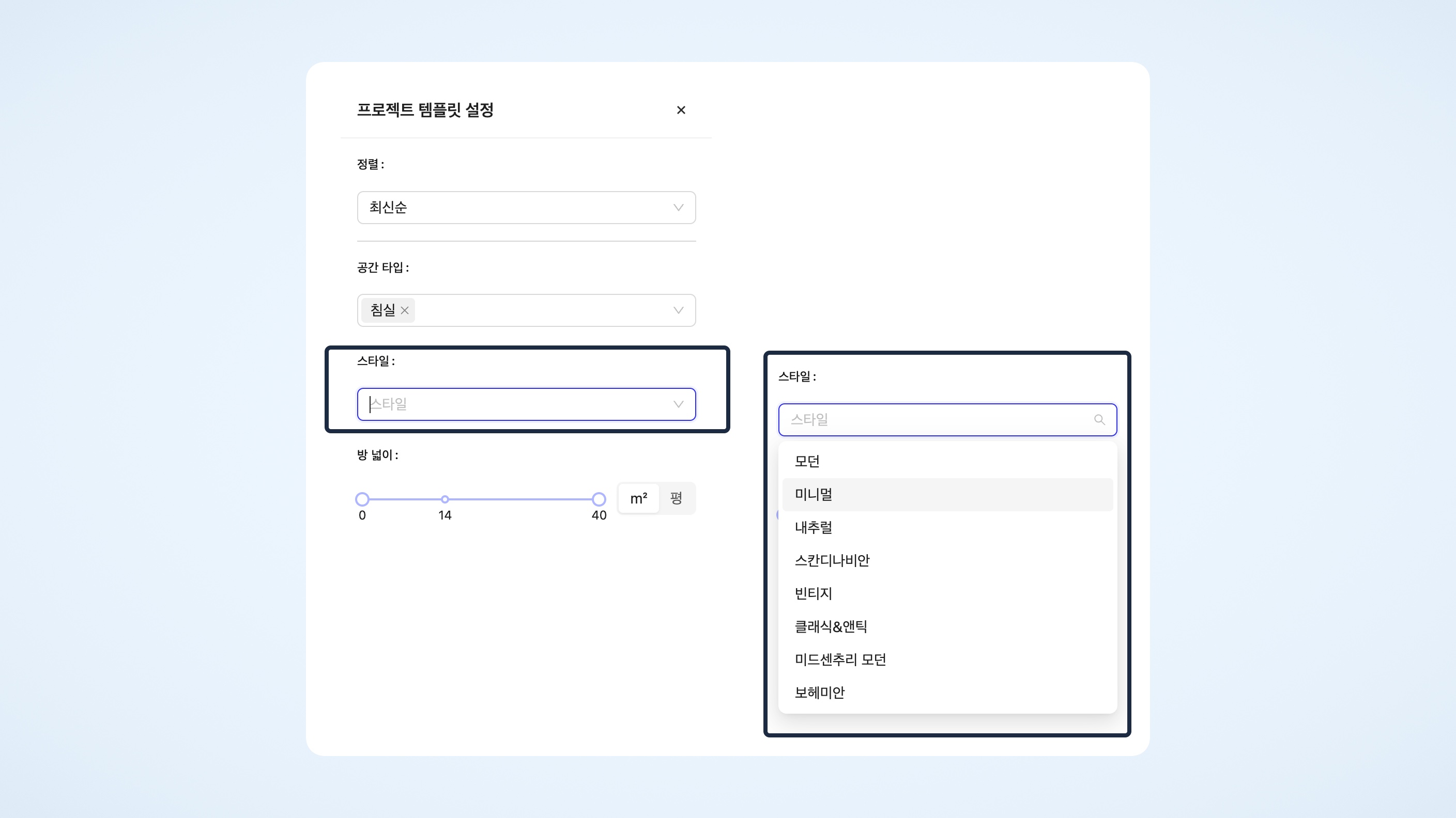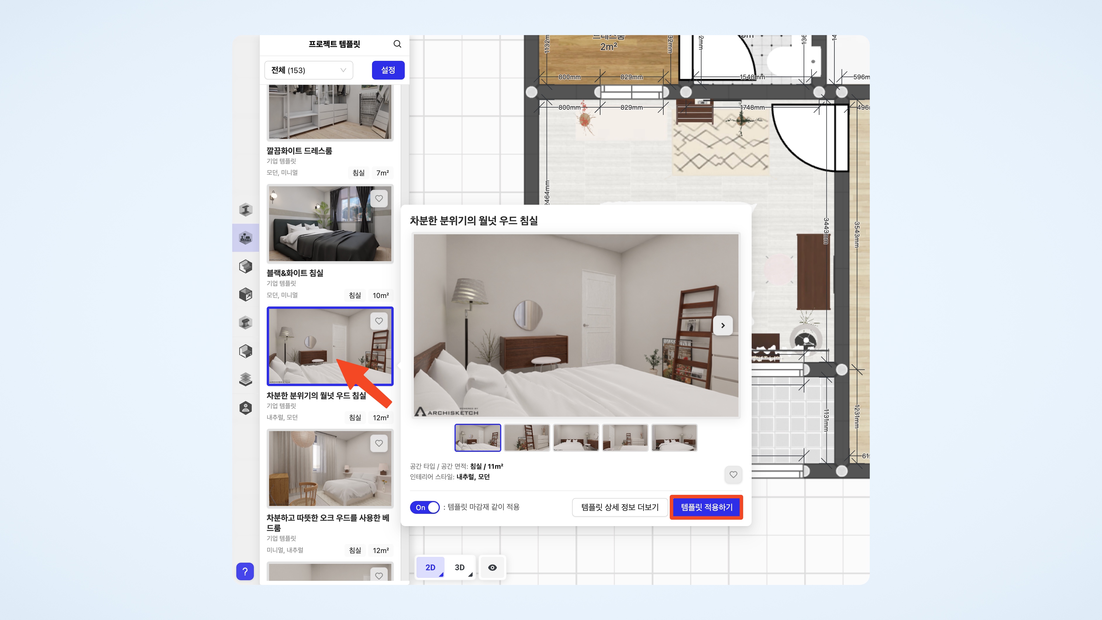 이 기능은 2D 모드에서만 사용 가능하며, 미리 준비된 다양한 인테리어 템플릿을 방에 불러올 수 있어, 빠르고 쉽게 스타일을 적용할 수 있습니다. [템플릿 적용하기] 버튼을 클릭하면 좌측에 해당 공간 타입에 맞는 템플릿 리스트가 표시됩니다. 스크롤을 내려 템플릿을 확인하고, [설정] 버튼을 눌러 필터를 적용해볼 수도 있어요.