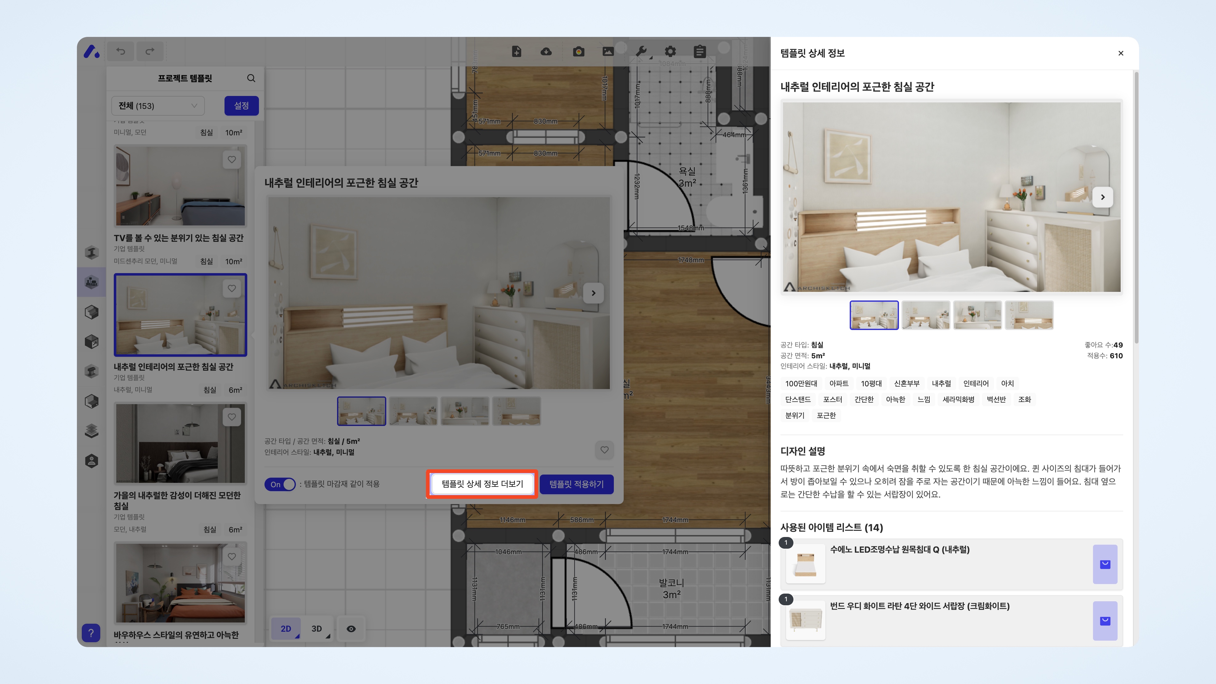 템플릿 리스트에서 [템플릿 상세 정보 더보기]를 클릭하면, 템플릿에 사용된 공간 설명과 아이템들에 대한 자세한 정보를 확인할 수 있습니다.