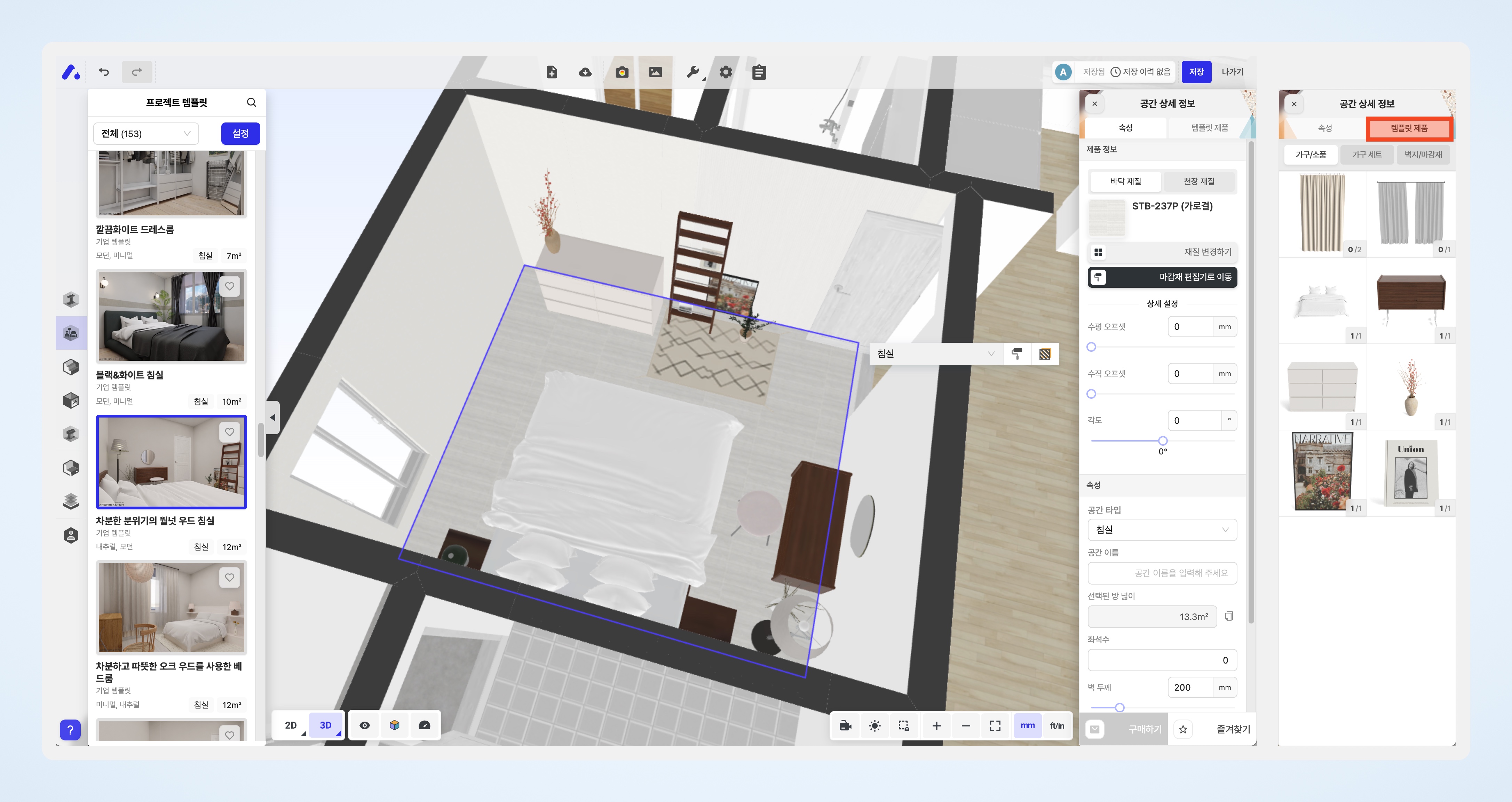 템플릿이 적용된 공간은 우측의 [공간 상세 정보]에서 [템플릿 제품]탭을 통해 사용된 가구와 마감재 정보를 확인하고 직접 적용할 수도 있습니다.
