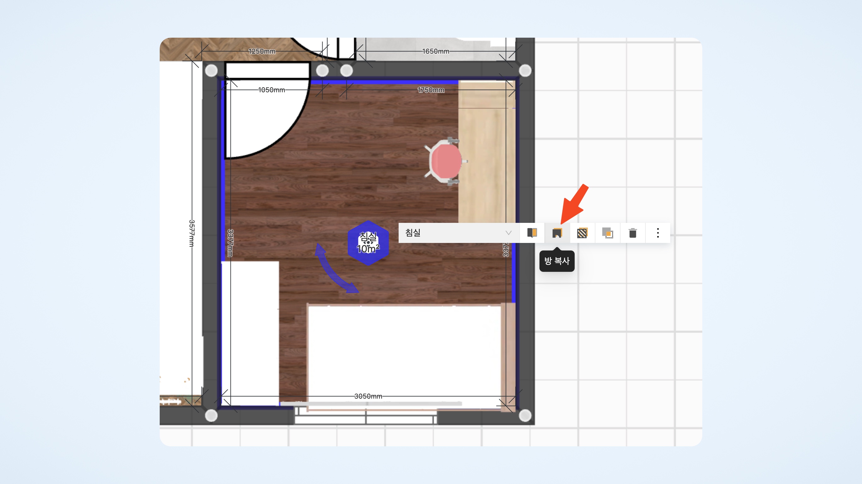 ❷ 방 복사: 가구와 마감재를 포함한 방을 한 번에 복제하여 빠르게 같은 구성을 만들 수 있습니다.