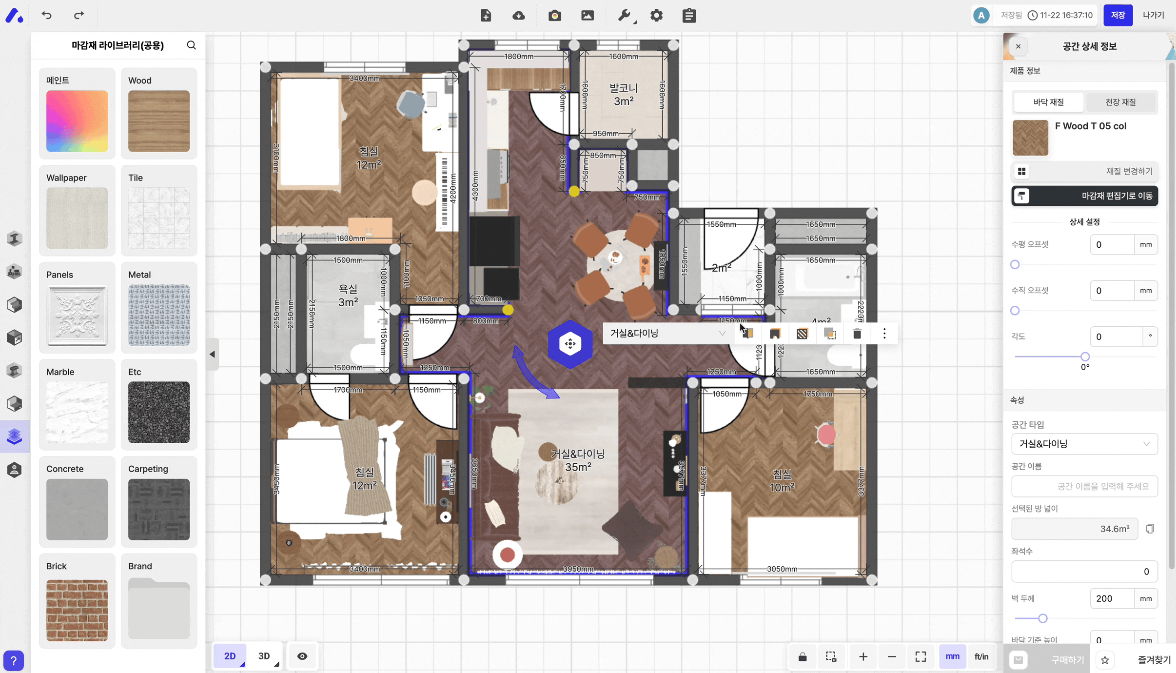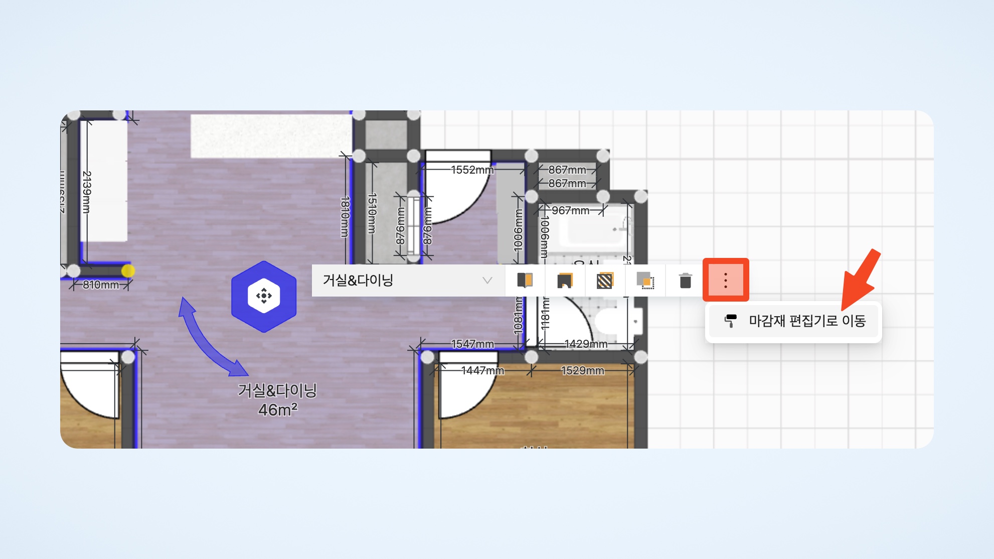 마감재 편집기는 하나의 공간에서 2개 이상의 다른 재질을 적용할 수 있는 고급 활용 기능입니다. 영역을 지정하여 원하는 재질을 적용해 보세요.