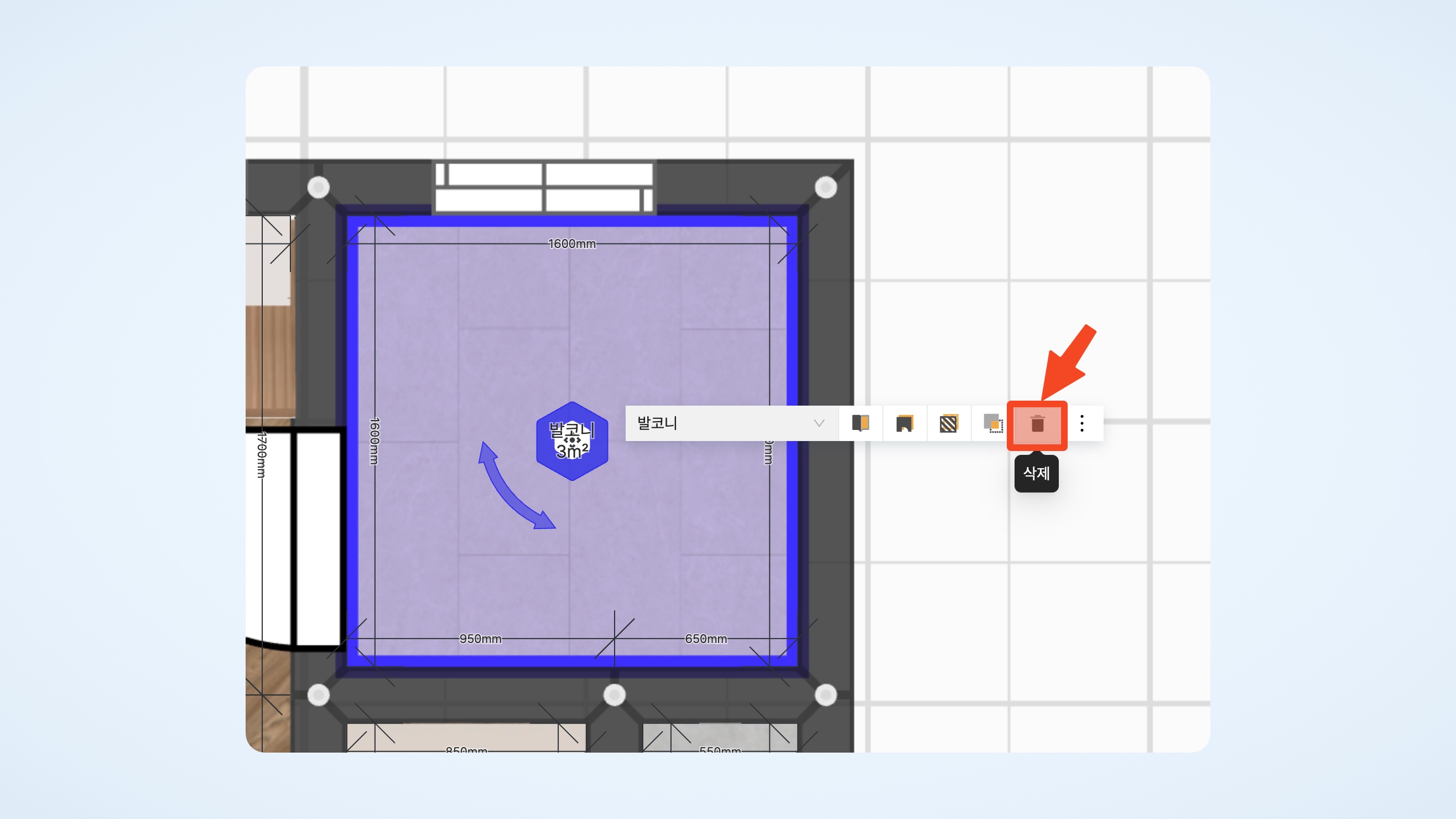 삭제하려는 공간을 클릭한 후 삭제 아이콘을 클릭하면 방을 삭제할 수 있습니다.또한, 키보드의 백스페이스(Backspace) 또는 Delete 키를 눌러서도 동일하게 삭제가 가능합니다.