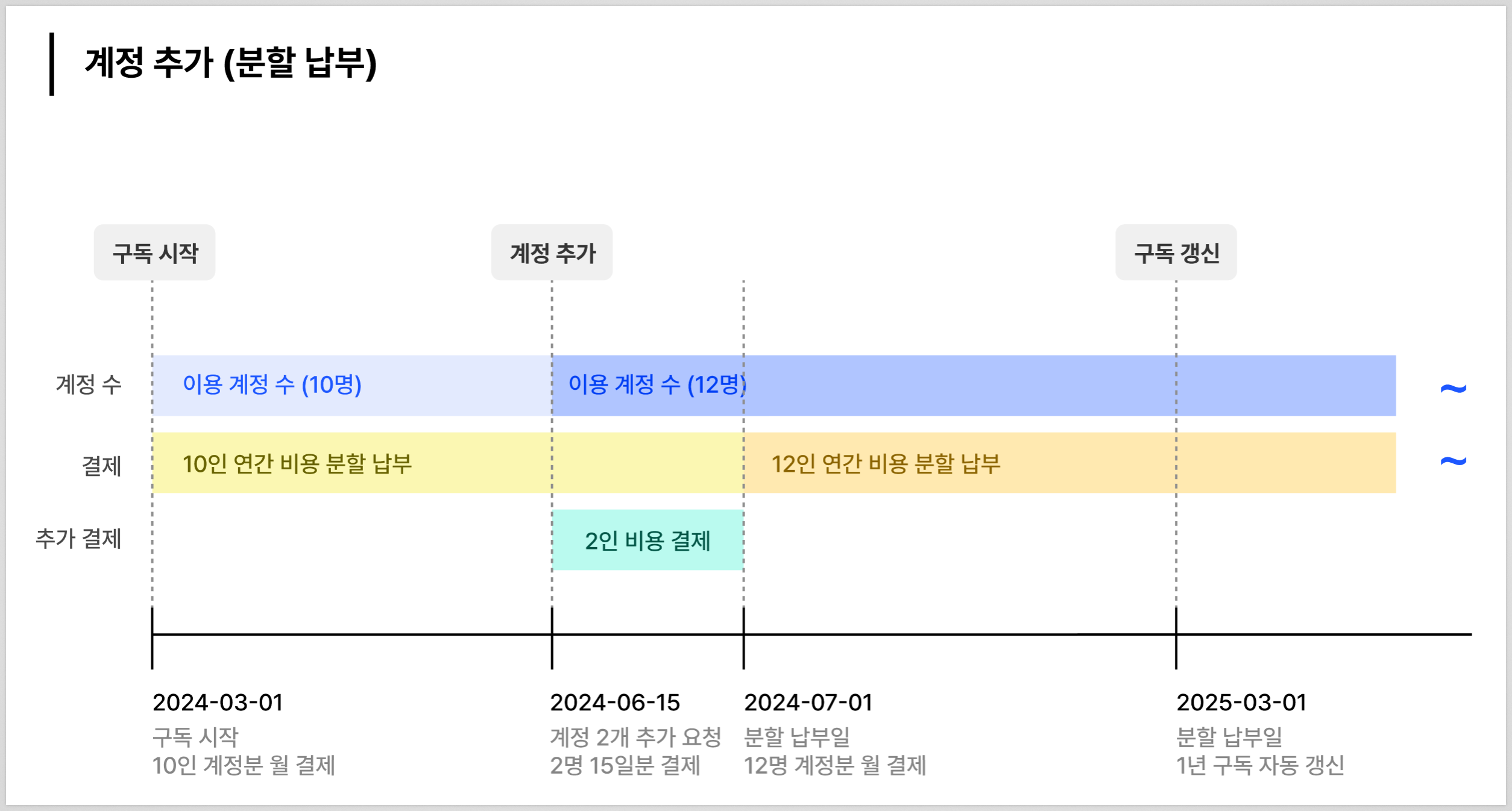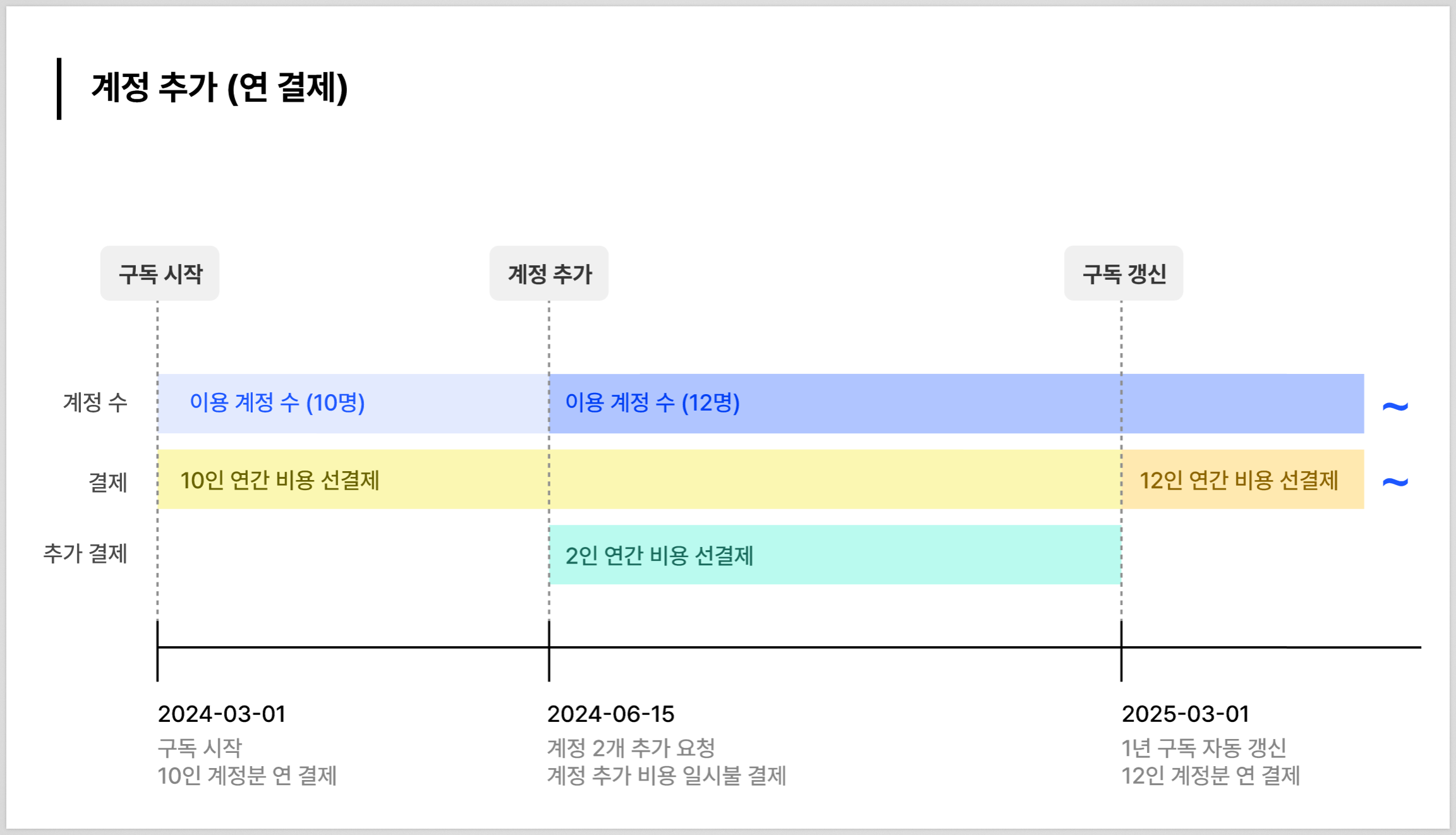 추가된 계정의 요금은 잔여 계약 기간을 기준으로 비례 계산되어 청구됩니다.