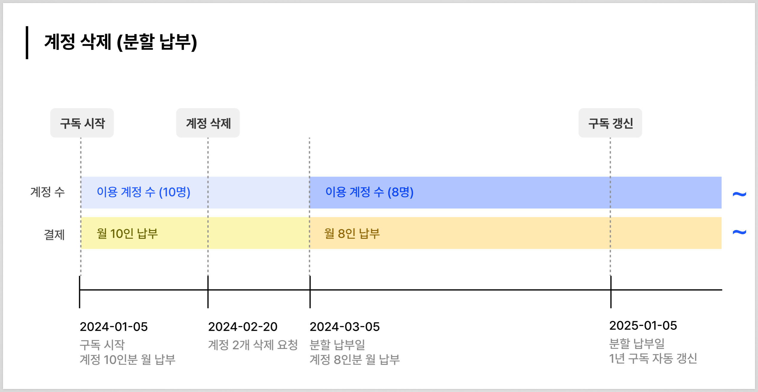 매월 결제일/갱신일에만 계정이 삭제가 가능하므로, 분할 결제는 환불액이 없습니다.