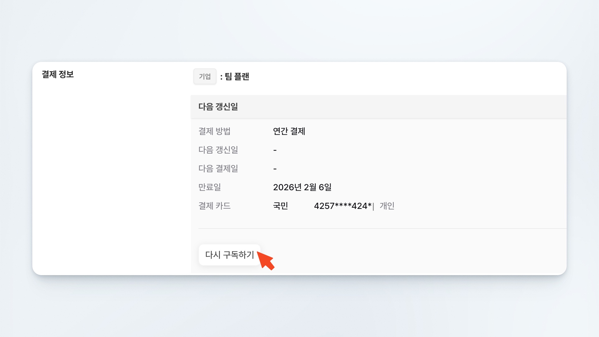 구독 유지 경로 : 대시보드 → 내 정보 → 계정 설정 → 결제 정보 → [다시 구독하기] 버튼 클릭