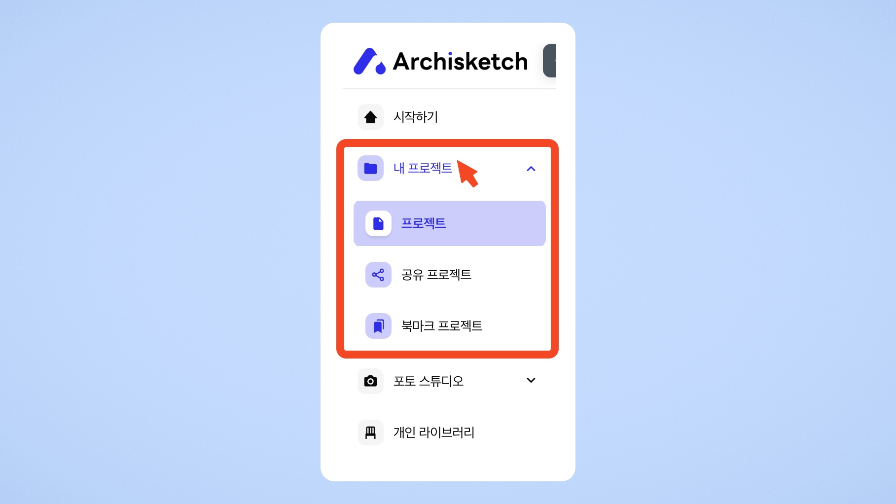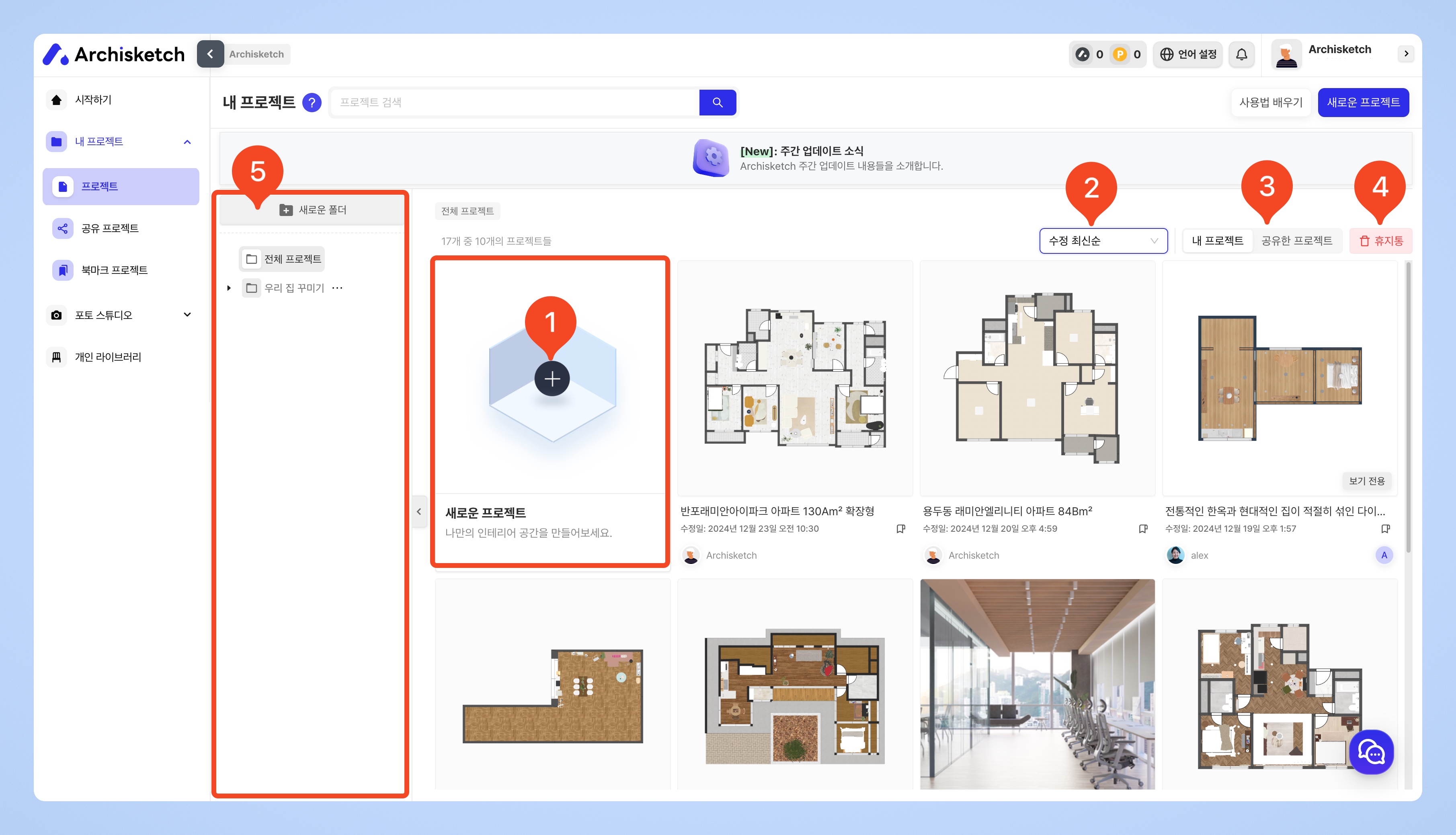 아키스케치 대시보드는 에디터에서 작업한 프로젝트와 렌더샷 결과물을 한 곳에서 관리하고 확인할 수 있는 중심 공간입니다. 에디터가 공간을 꾸미고 렌더샷을 찍는 작업을 하는 반면, 대시보드는 그 작업물들을 효율적으로 관리하고 추적하는 역할을 합니다.