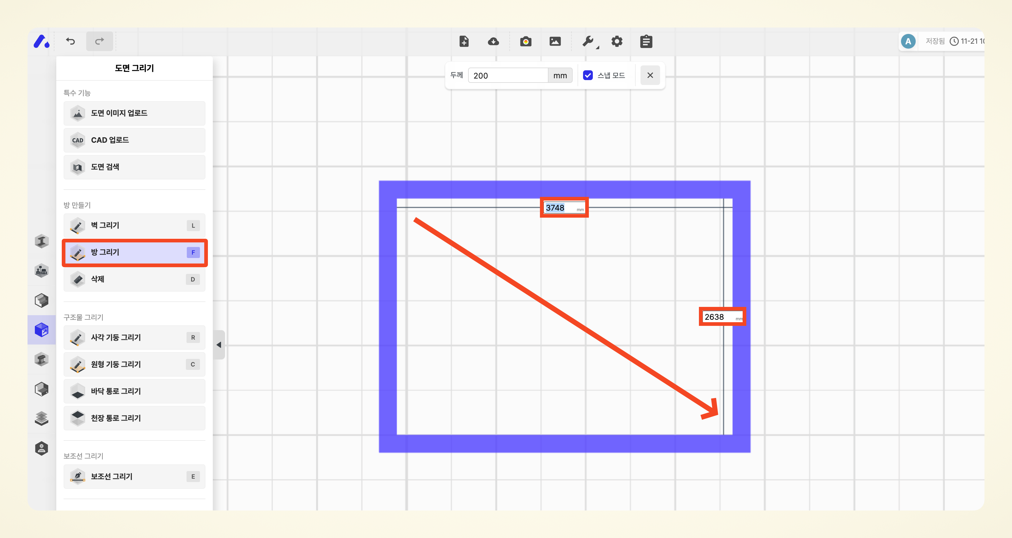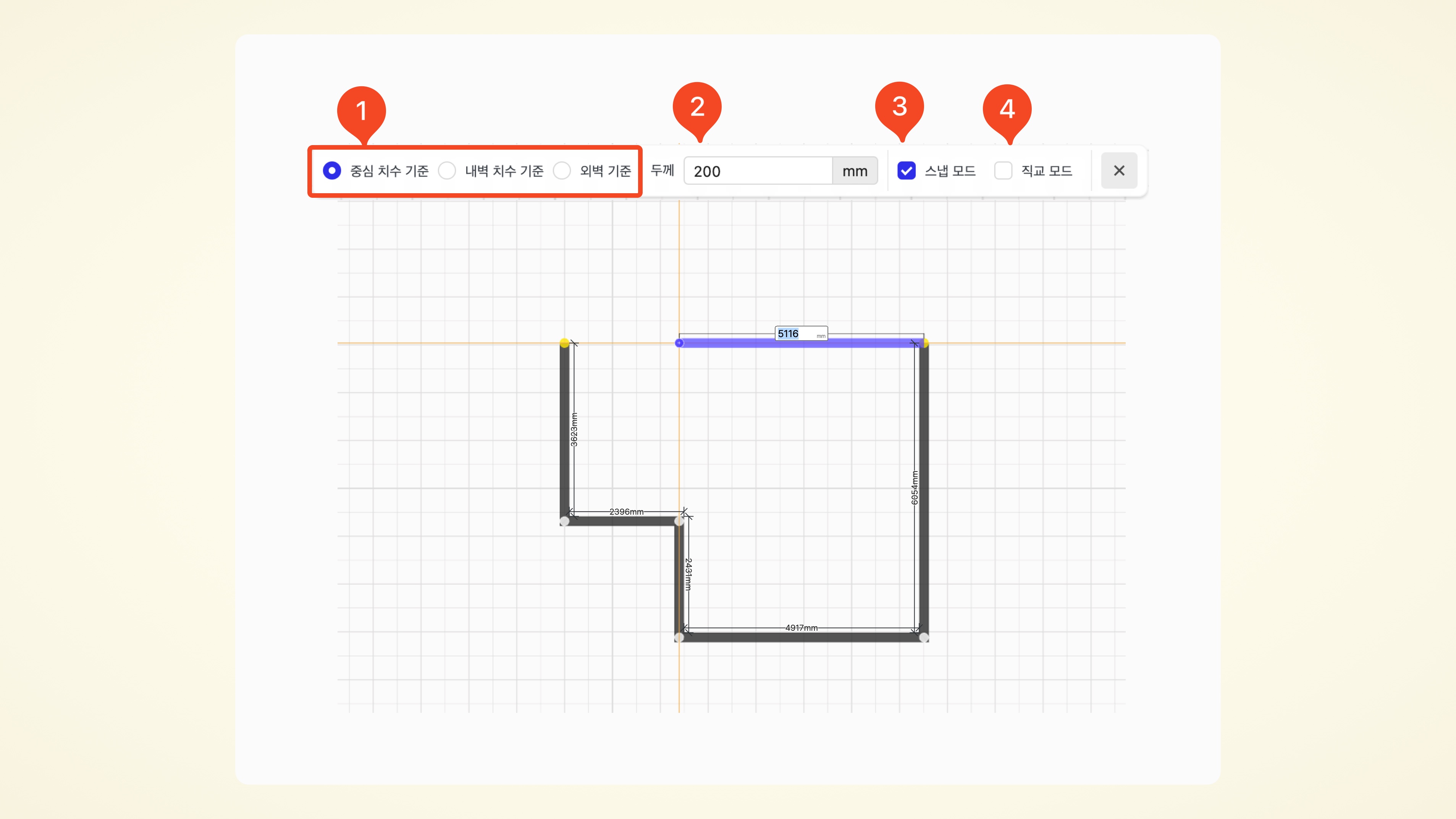 ❸ 스냅 모드: 스냅 모드를 켜면 노란색 가이드 라인이 활성화되어 벽을 그리기 쉽게 도와줍니다. 스냅 모드를 끄고 자유롭게 그릴 수도 있습니다.