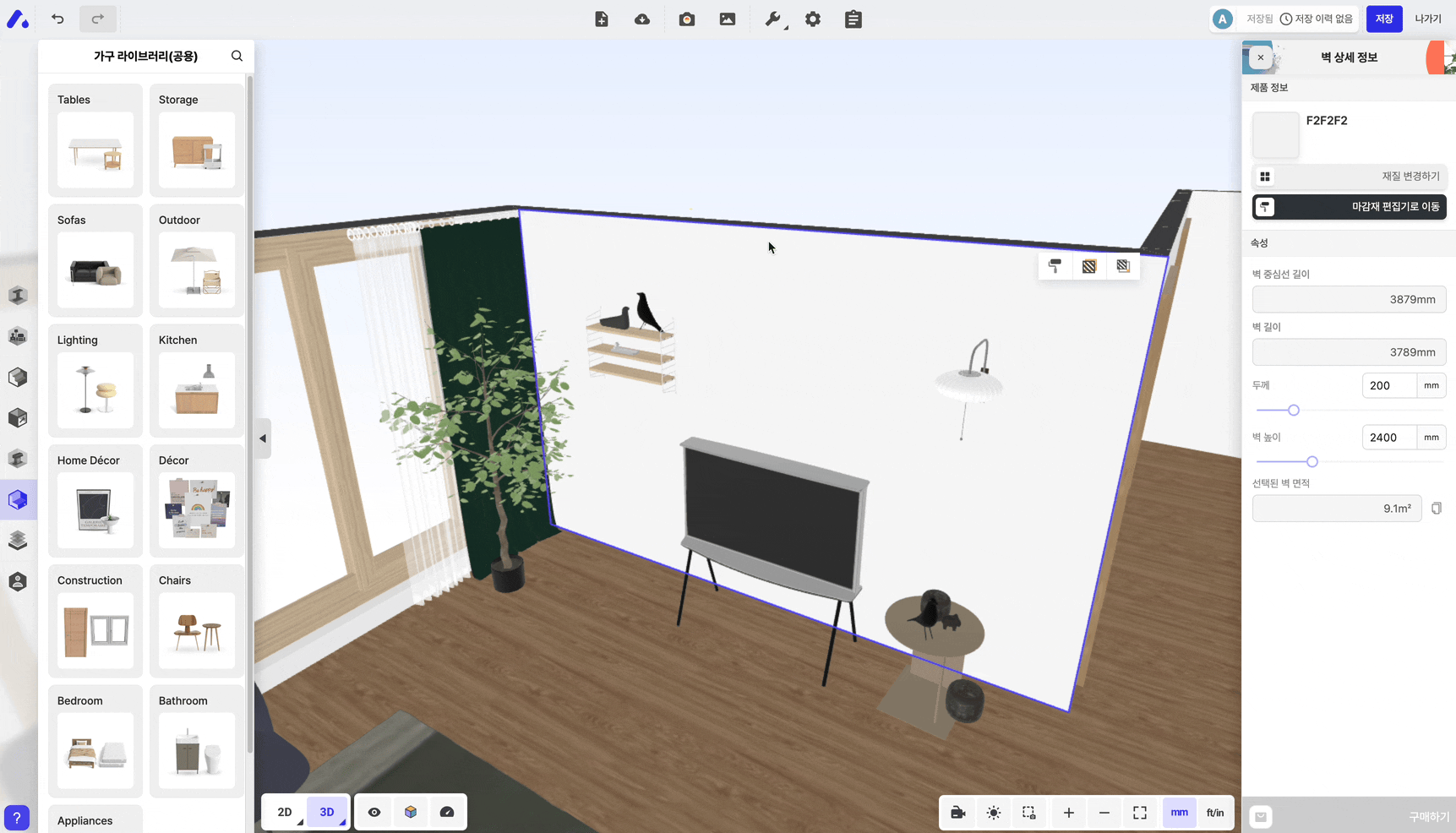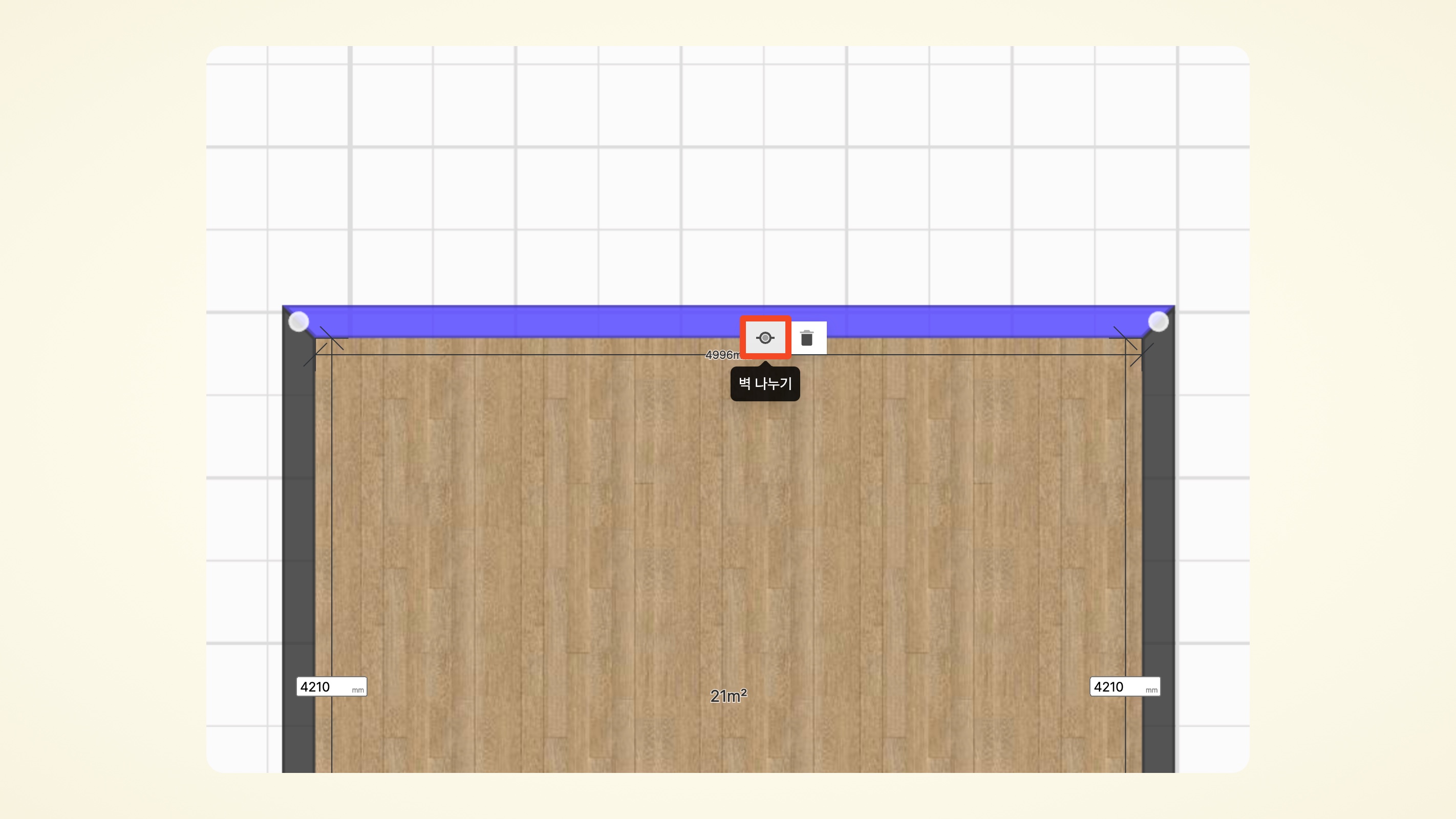벽 나누기 기능을 사용하면 벽을 더 다양한 방식으로 편집하고 창의적인 공간 설계가 가능합니다. 벽을 클릭하면 벽 나누기 도구가 나타나요.