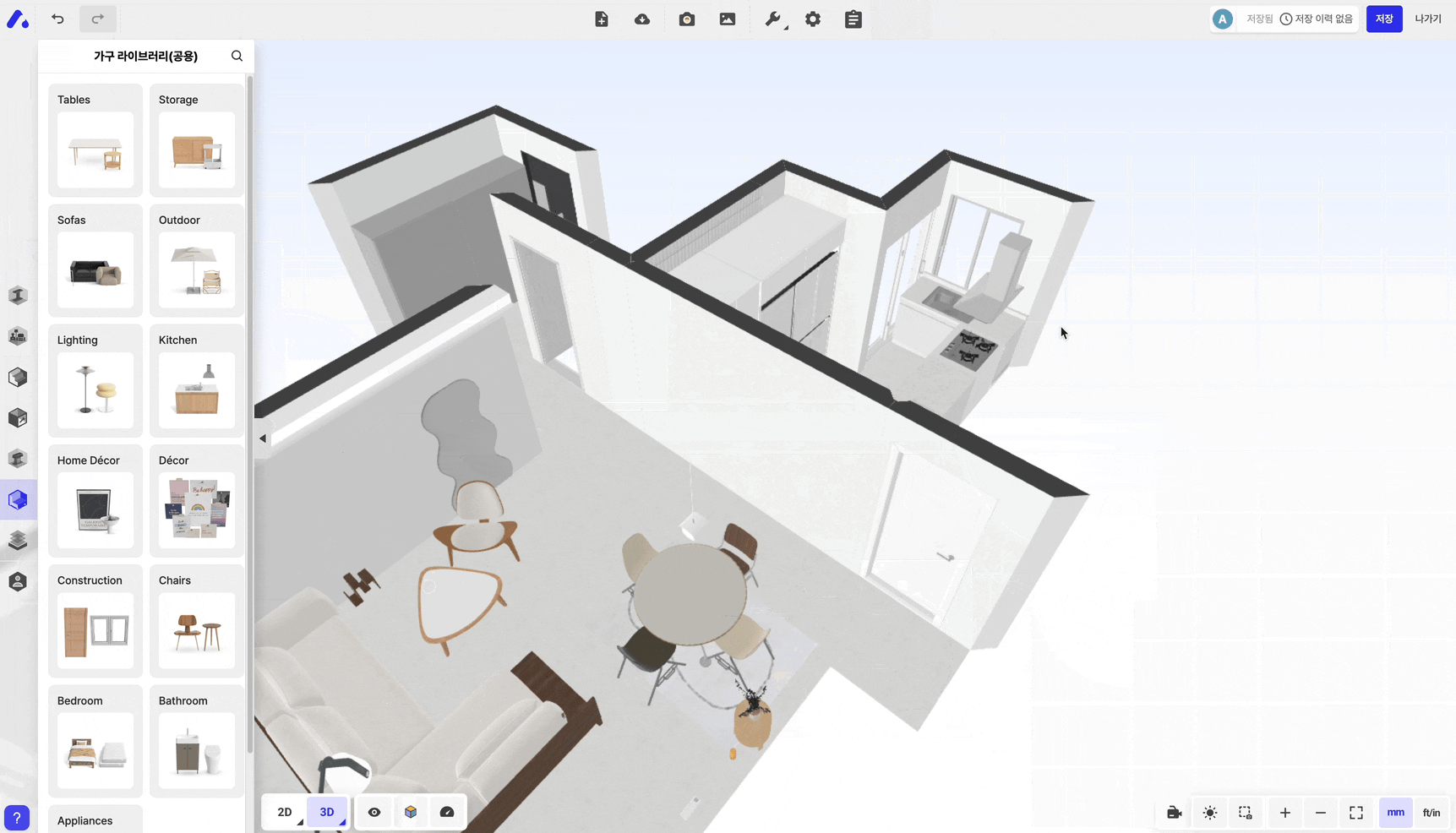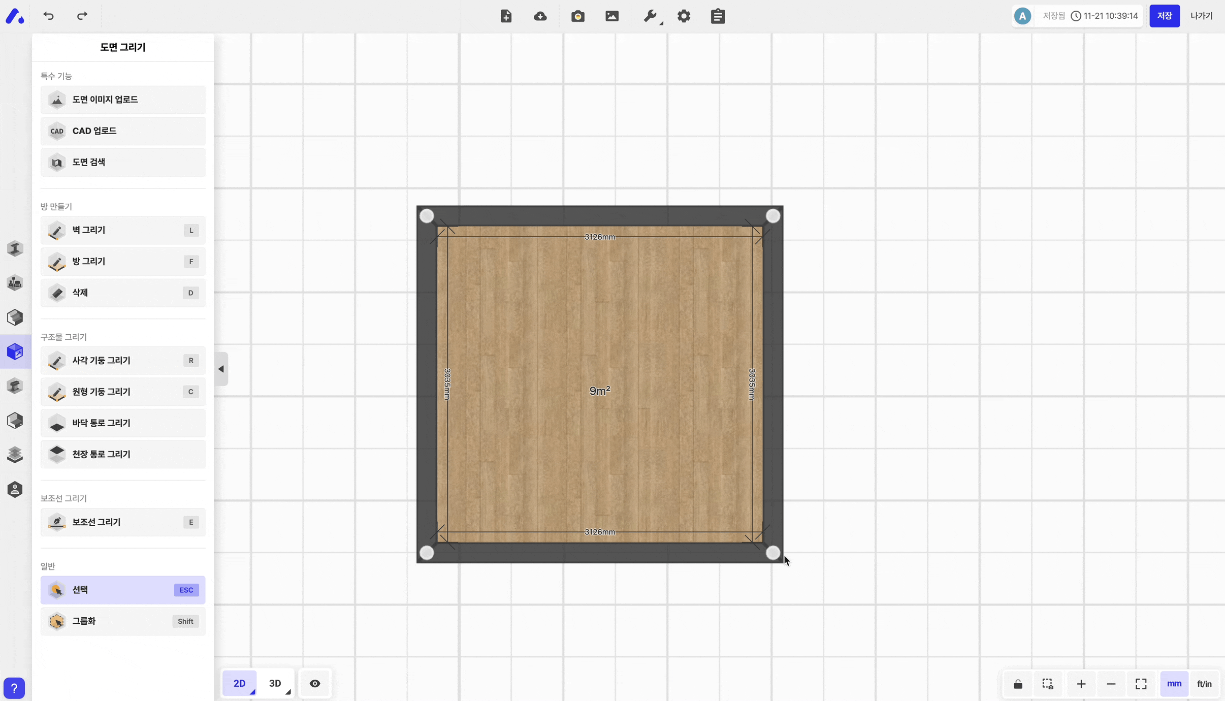벽뿐만 아니라, 꼭짓점을 잡고 움직여서 사각형이 아닌 다양한 형태의 방을 만들 수 있습니다. 원하는 꼭짓점을 클릭하여 드래그하면, 자유로운 형태로 방의 크기와 모양을 조정할 수 있습니다.