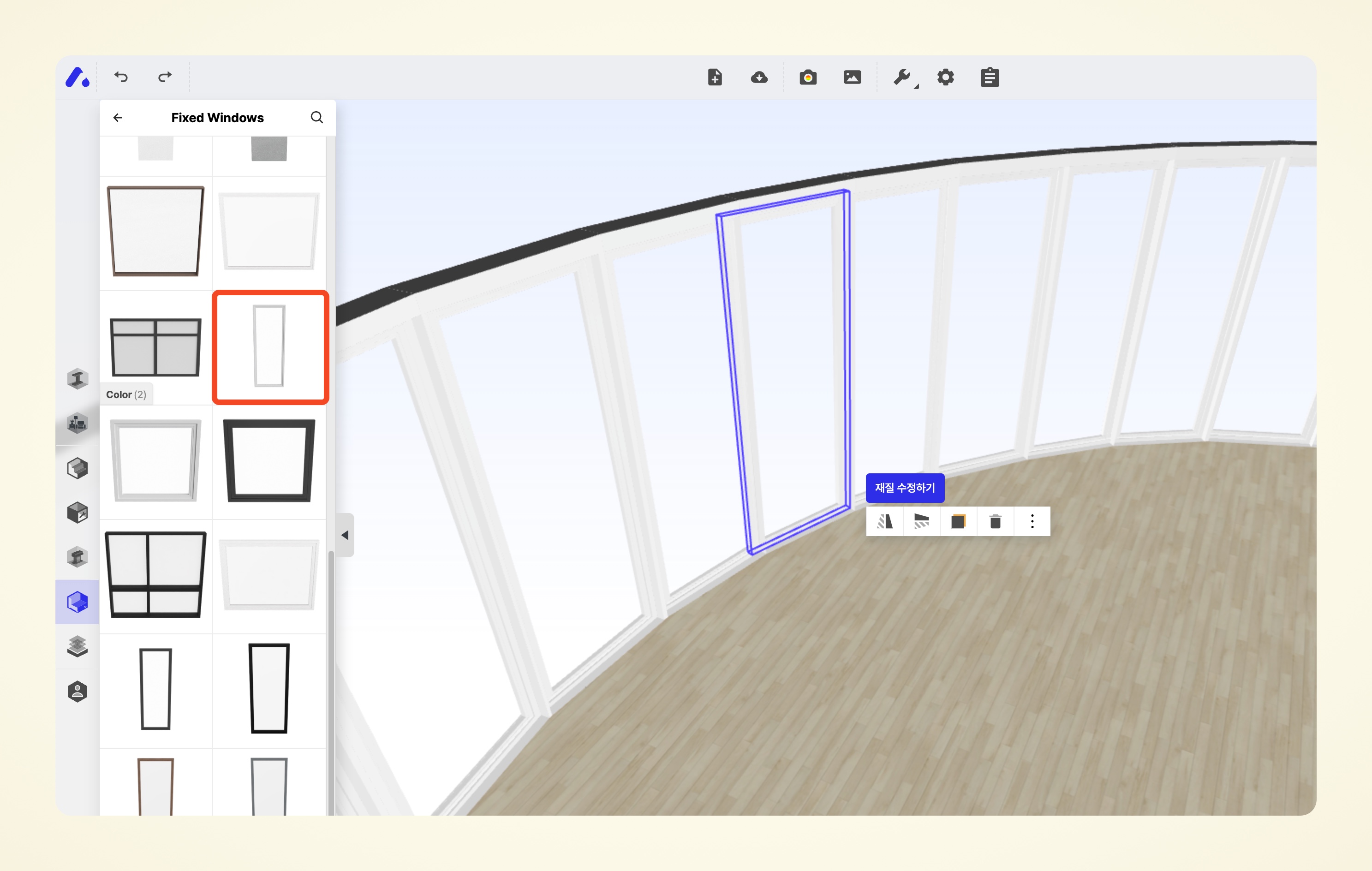벽면을 곡선 형태로 설정하는 것은 어렵지만, [벽 나누기] 기능을 활용하여 벽체를 곡면처럼 구현할 수 있습니다. 벽을 여러 번 나누면 곡면에 가까운 형태로 만들 수 있으며, 고정창 제품의 너비를 조절하여 배치하면 파노라마 창과 같은 효과도 연출 가능합니다.