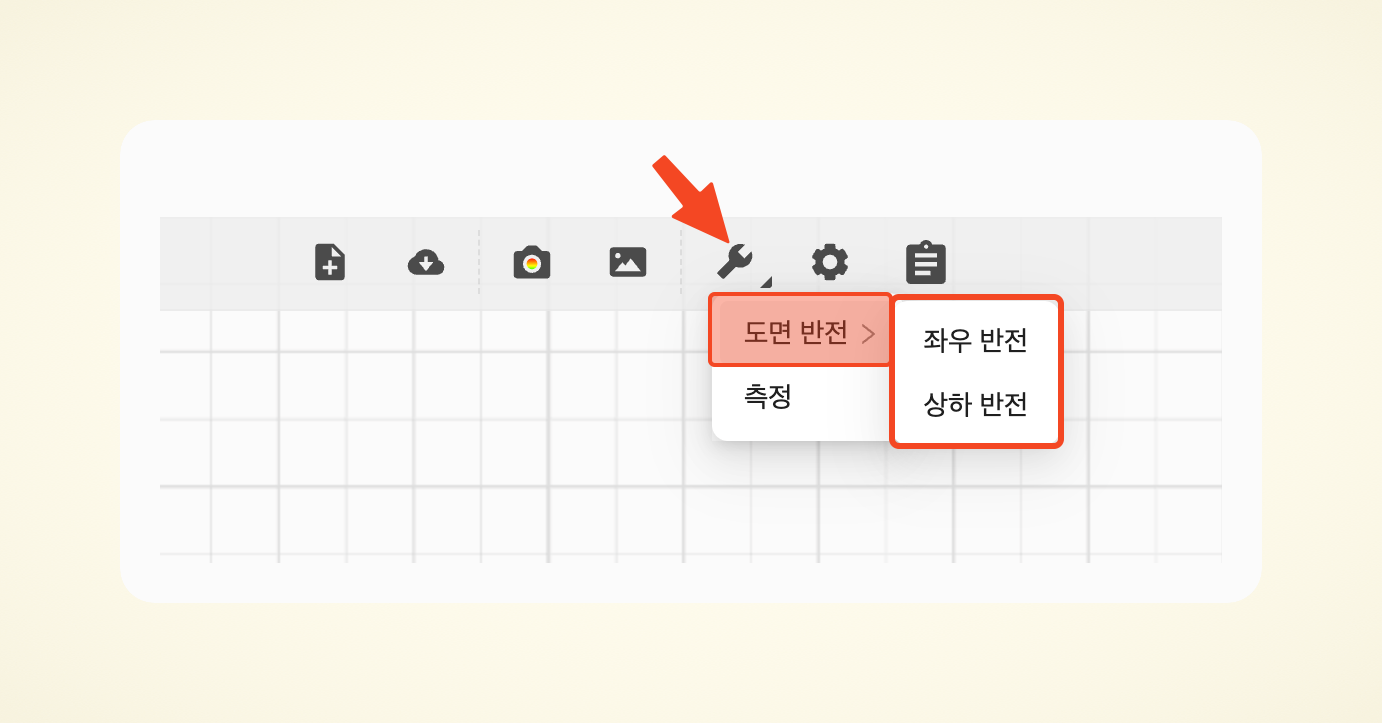 에디터 상단 툴바에서 공구 모양의 아이콘을 클릭하면 도면 반전 기능을 찾을 수 있습니다.