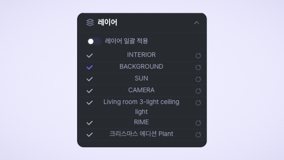 레이어에는 렌더샷에 포함된 모든 빛/조명 정보가 표시됩니다. 레이어를 클릭하여 개별 빛을 조절할 수 있어요.