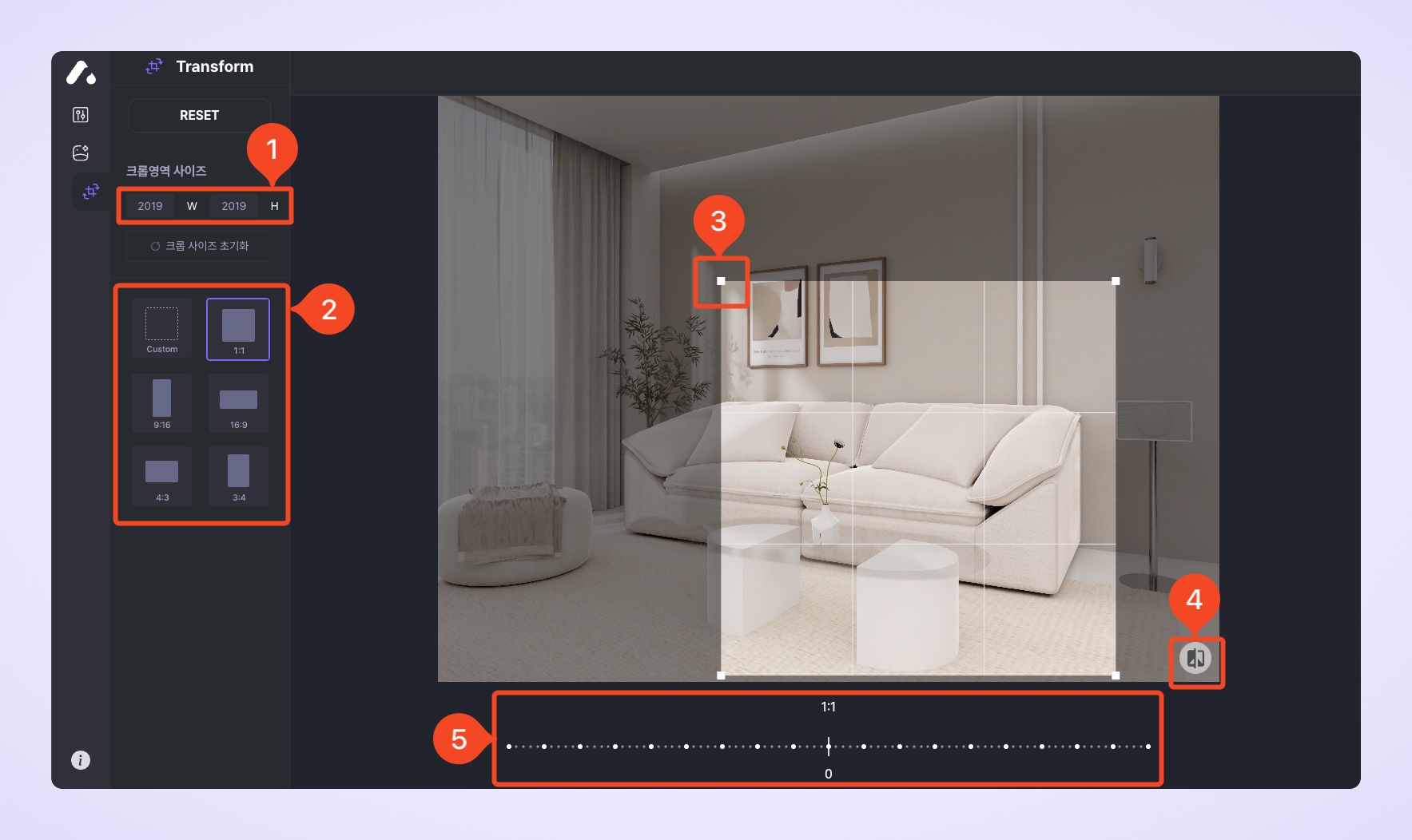 ❶ 크롭영역 사이즈 : 숫자를 입력하여 정확한 크기로 자를 수 있습니다.