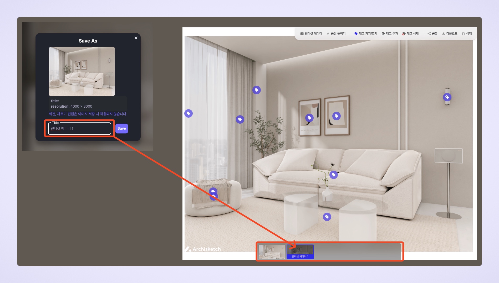 렌더샷 에디터에서 편집한 렌더샷은 현재 다운로드만 가능하며, 아쉽게도 아직 아키스케치의 다른 기능과는 연동되지 않아요. 하지만 앞으로는 다양한 서비스와 연동될 수 있도록 준비 중이에요!