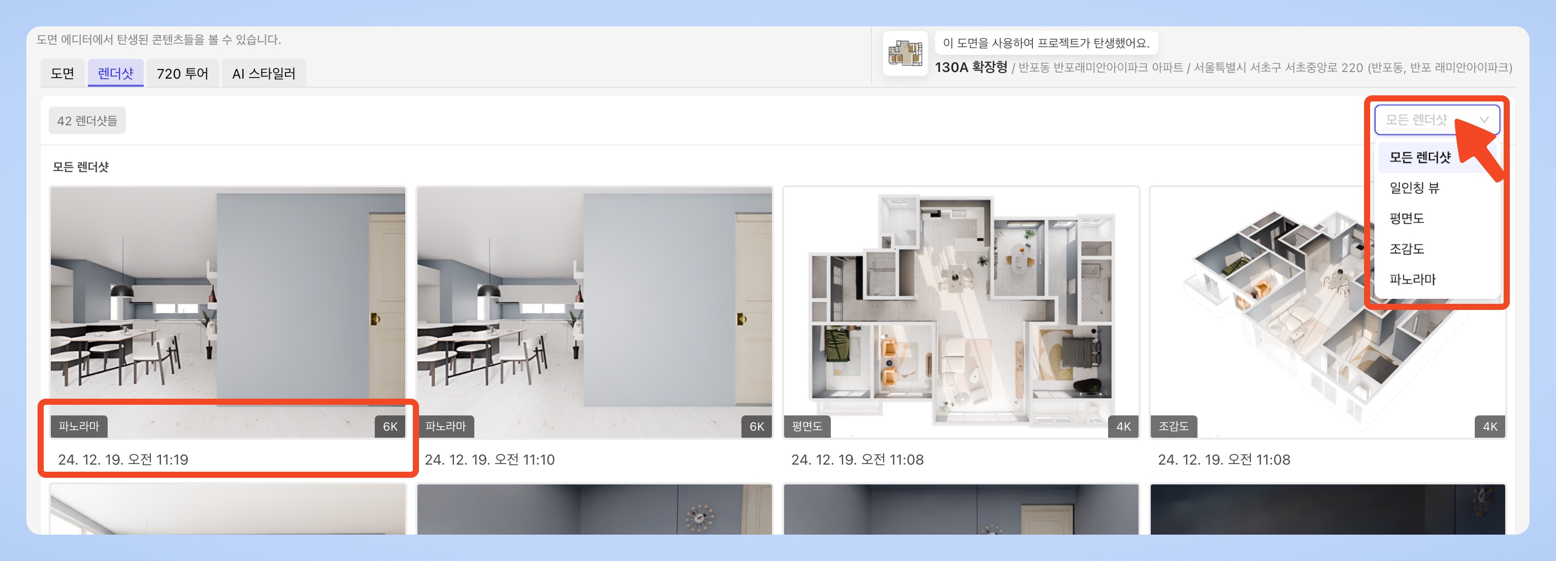 렌더샷 페이지에서는 촬영한 모든 렌더샷을 한눈에 확인할 수 있어 관리가 매우 편리합니다. 각 렌더샷의 종류, 해상도, 촬영 일시 등 상세 정보도 함께 제공되어 더 쉽게 확인할 수 있습니다. 또한, 페이지 우측 상단에 있는 필터를 통해 일인칭 뷰, 평면도, 조감도, 파노라마 등 원하는 유형별로 렌더샷을 분류하여 볼 수 있어 더욱 효율적으로 사용할 수 있습니다.