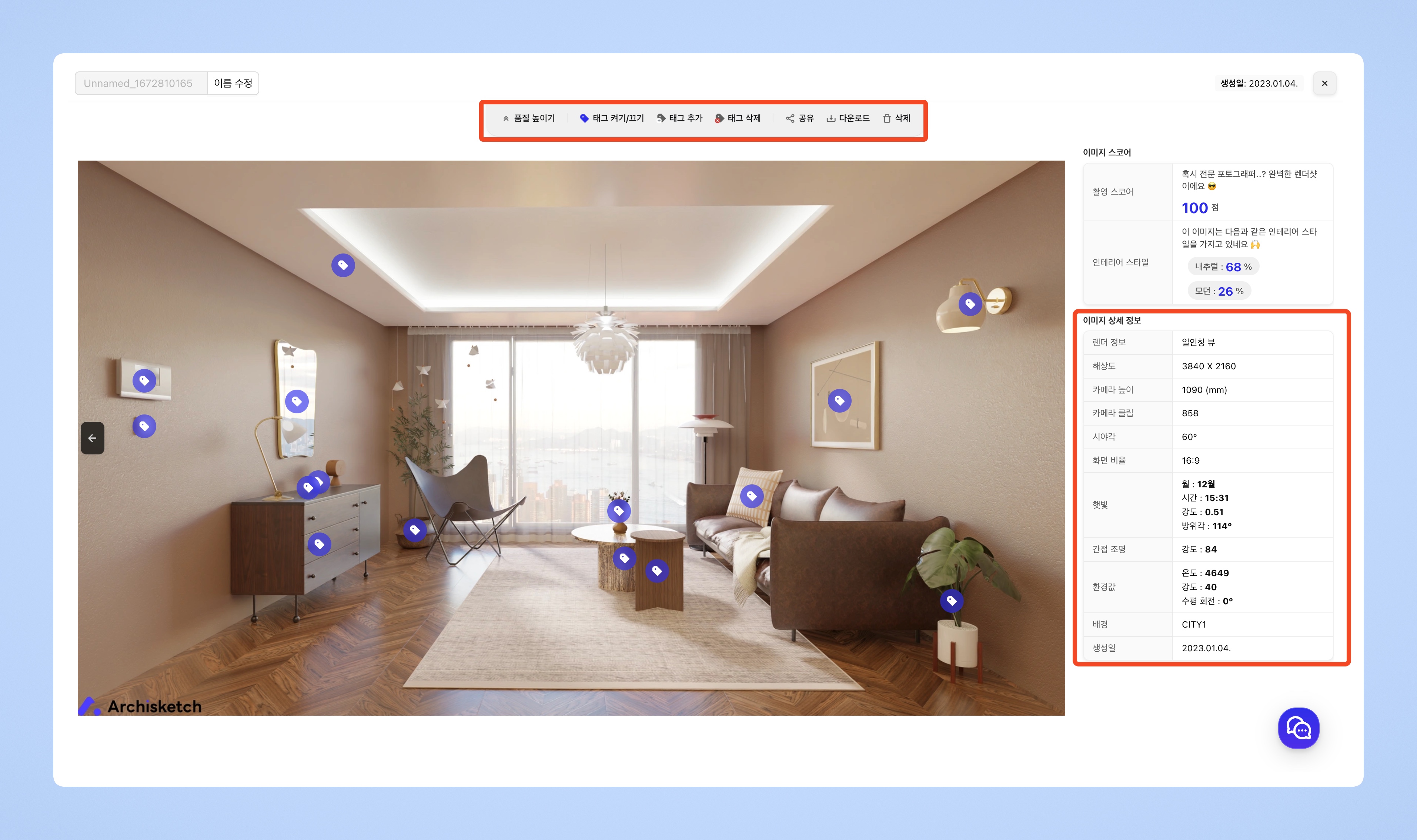 아키스케치에서는 렌더샷을 찍을 때 제품의 정보 태그가 자동으로 추가됩니다.