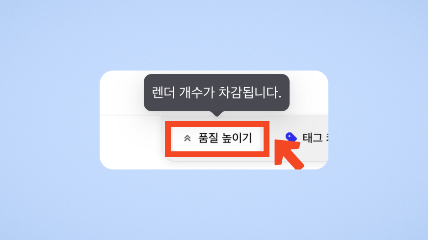 품질 높이기는 Standard 및 2K 해상도의 렌더샷을 4K로 업그레이드하는 기능입니다. 품질 높이기를 클릭하면 한 번 더 렌더링이 진행됩니다.