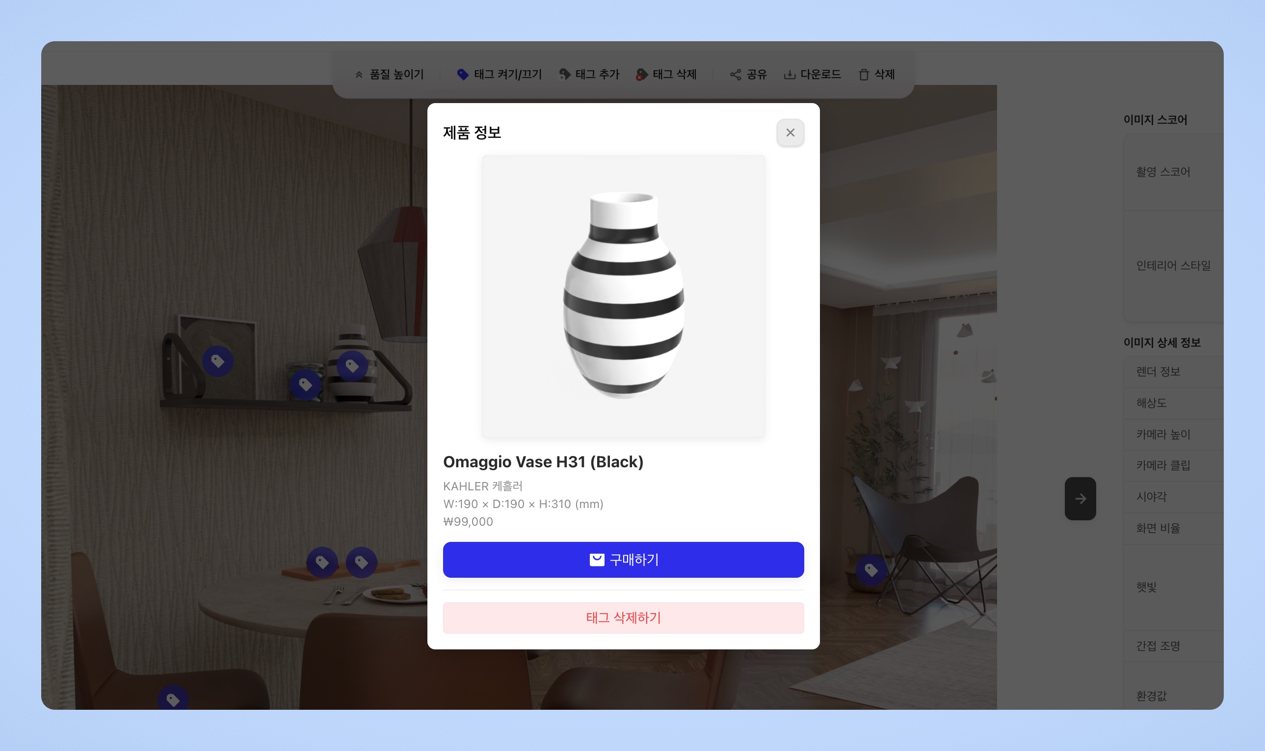 렌더샷 자동 태그는 같은 방 안에 있는 제품을 카메라가 인식해 촬영했을 때 생성됩니다. 카메라 클립을 사용해 다른 방을 촬영한 경우 태그가 붙지 않을 수 있어요.