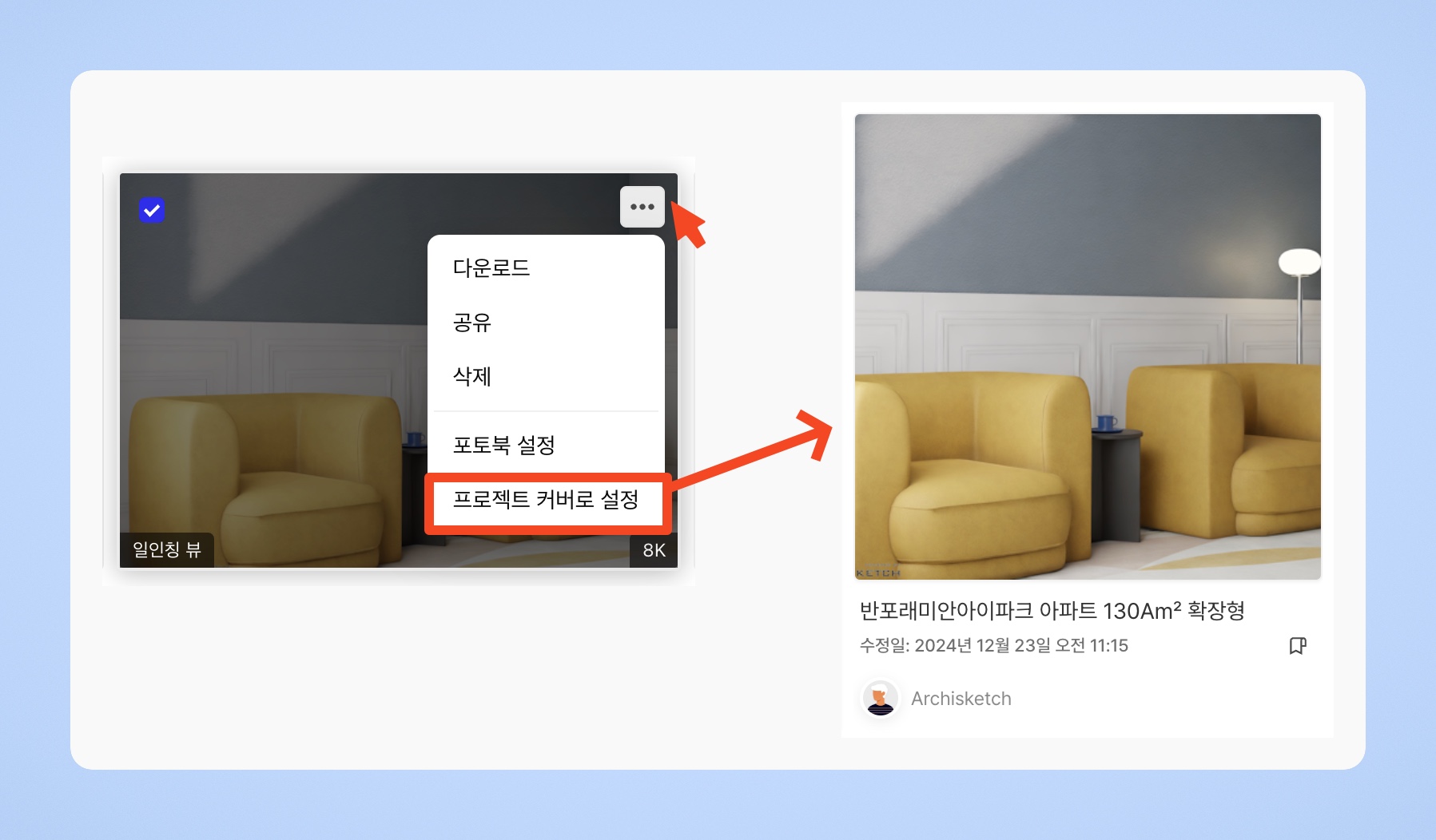 렌더샷의 우측 상단에 있는 [더보기] 버튼을 클릭하면, 해당 렌더샷을 프로젝트 커버로 설정할 수 있습니다. 마음에 드는 렌더샷을 커버로 설정하면, 내 프로젝트의 썸네일로 표시됩니다. 이를 통해 프로젝트를 시각적으로 더 쉽게 구분할 수 있고, 깔끔하고 직관적으로 프로젝트를 관리할 수 있어요.