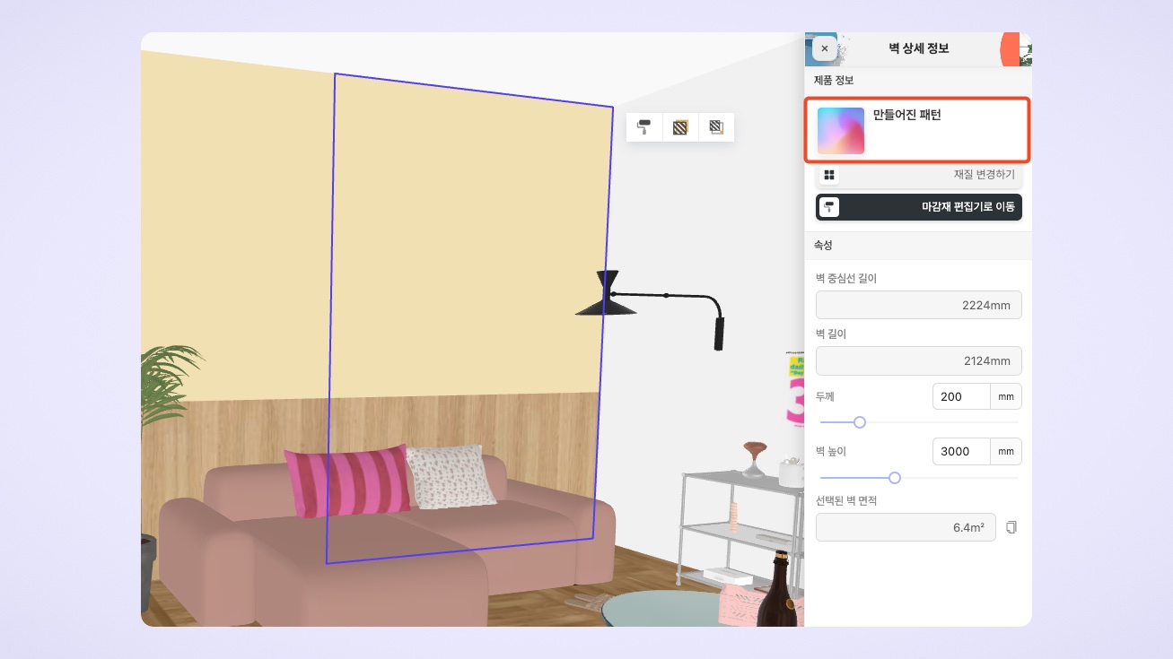 벽을 클릭하면 마감재가 적용된 면의 제품 정보가 '만들어진 패턴'으로 표시됩니다.