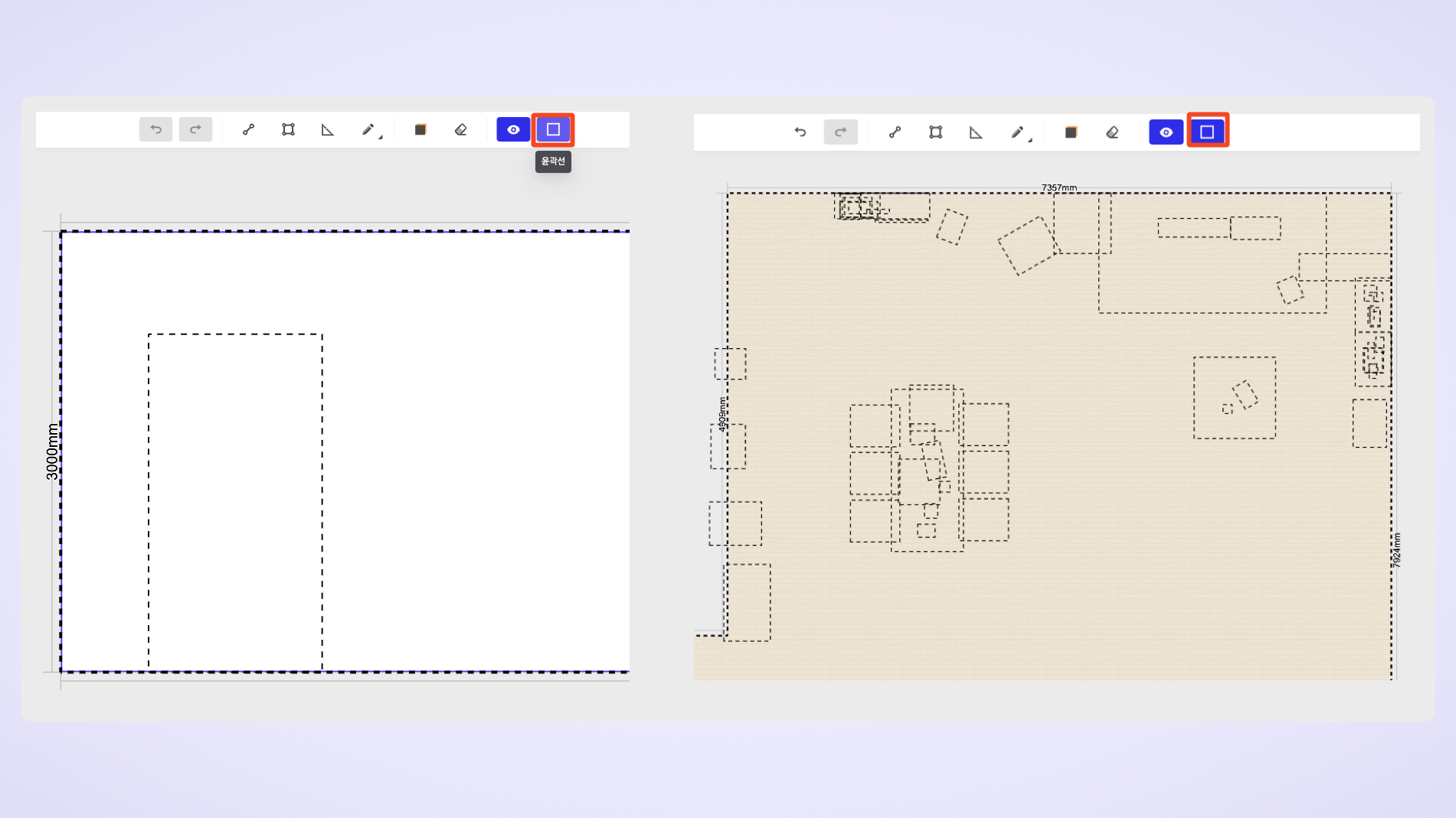 마감재 편집기 상단의 [윤곽선] 아이콘을 클릭하면 벽/바닥 등에 배치된 제품들의 윤곽선을 볼 수 있습니다. 이를 통해 벽의 문/창문 위치와 바닥에 놓인 제품들의 대략적인 위치를 쉽게 파악할 수 있습니다.