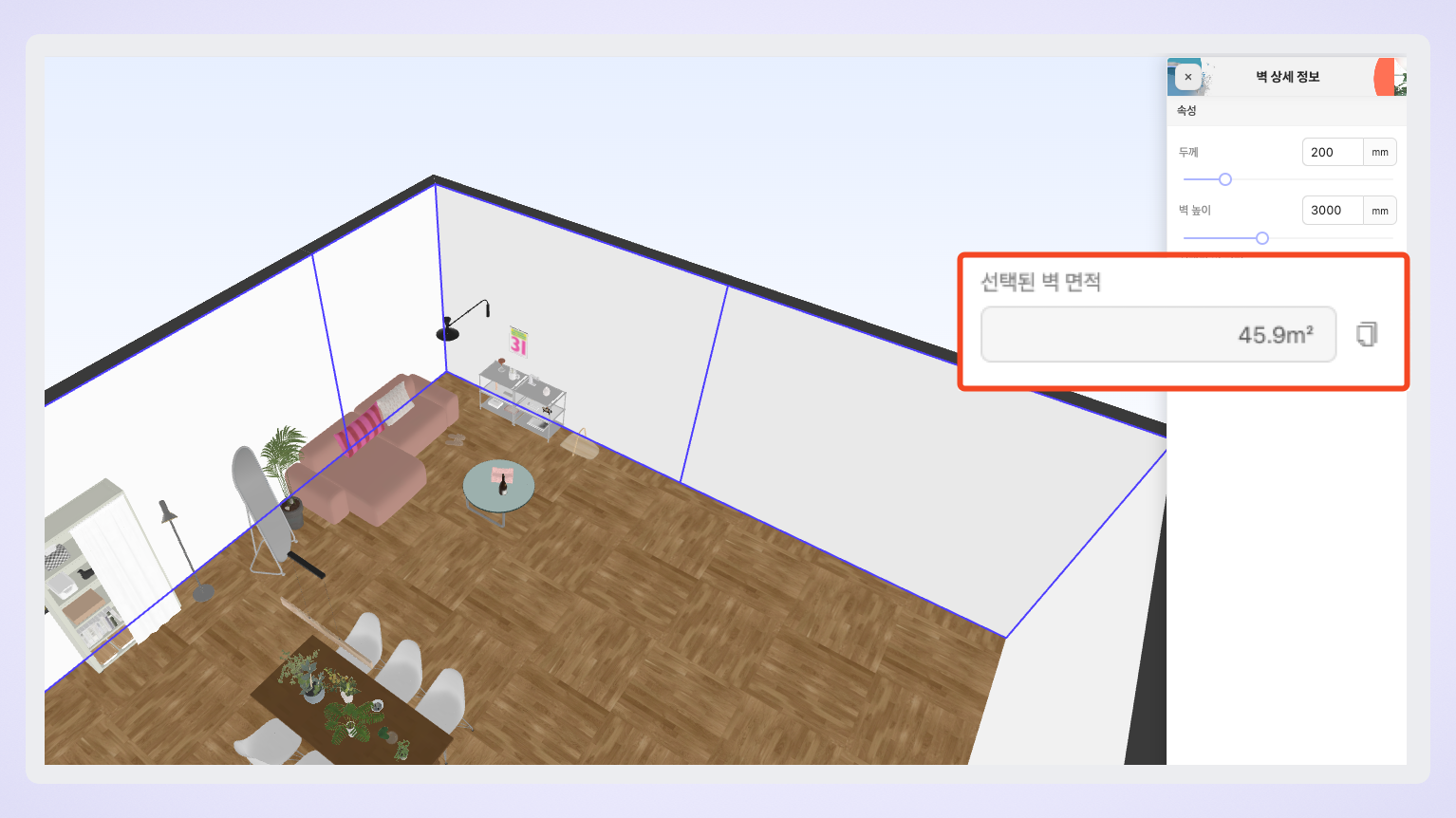 벽을 클릭했을 때, 우측 [벽 상세 정보] 패널에서 벽 면적을 확인할 수 있어요.
