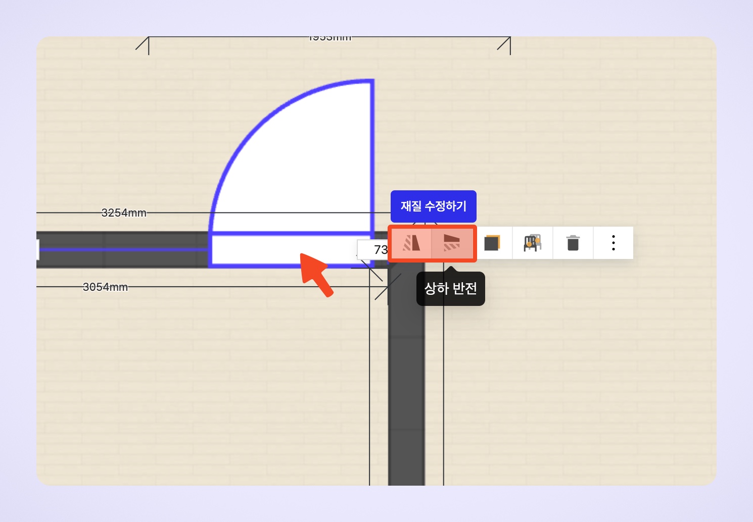 여닫이문은 문이 열리는 방향을 설정할 수 있는 기능을 제공합니다. 제품을 선택한 후, [좌우 반전] 또는 [상하 반전] 버튼을 클릭하여 문이 열리는 방향을 손쉽게 변경할 수 있습니다. 이를 통해 실제 설치 환경을 보다 정확하게 반영하거나, 공간에 맞는 최적의 배치를 할 수 있습니다.
