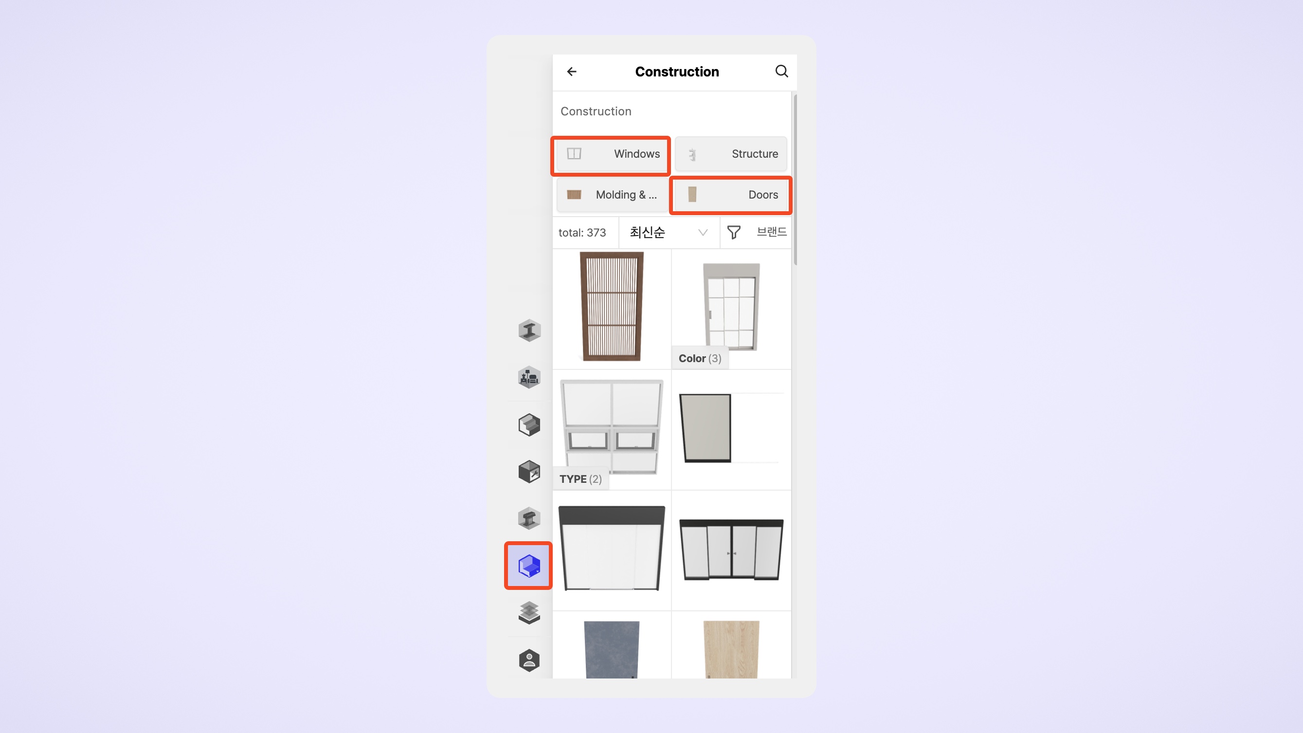 문과 창문 제품은 좌측 탭의 [가구 라이브러리 - Construction]에서 찾을 수 있습니다. 다양한 카테고리로 구분된 제품들 중에서 원하는 스타일과 기능을 갖춘 제품을 선택하여 배치할 수 있습니다. 공간에 맞는 문과 창문을 배치하여 더욱 실용적이고 미적인 디자인을 완성해 보세요.