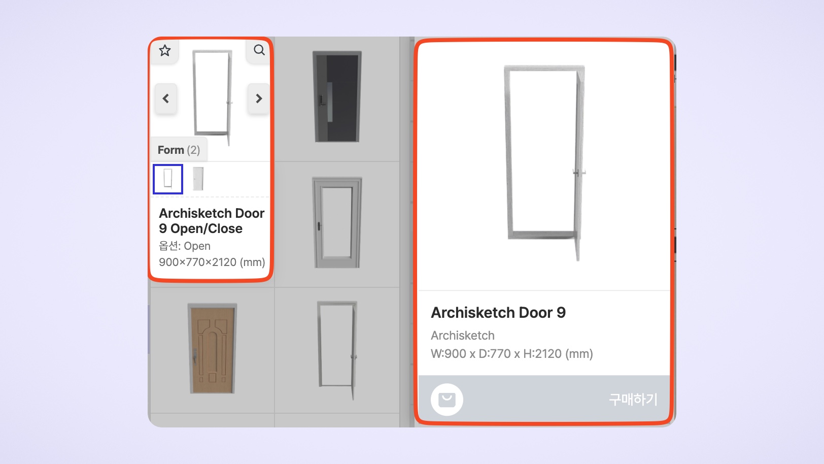 열린 형태로 제작된 문도 있습니다. 문이 열리고 닫히는 애니메이션 기능은 지원하지 않지만, 열린 문을 찾아 배치해 보세요. 열린 문을 활용하면 공간 배치나 구상에 더욱 도움이 될 거예요