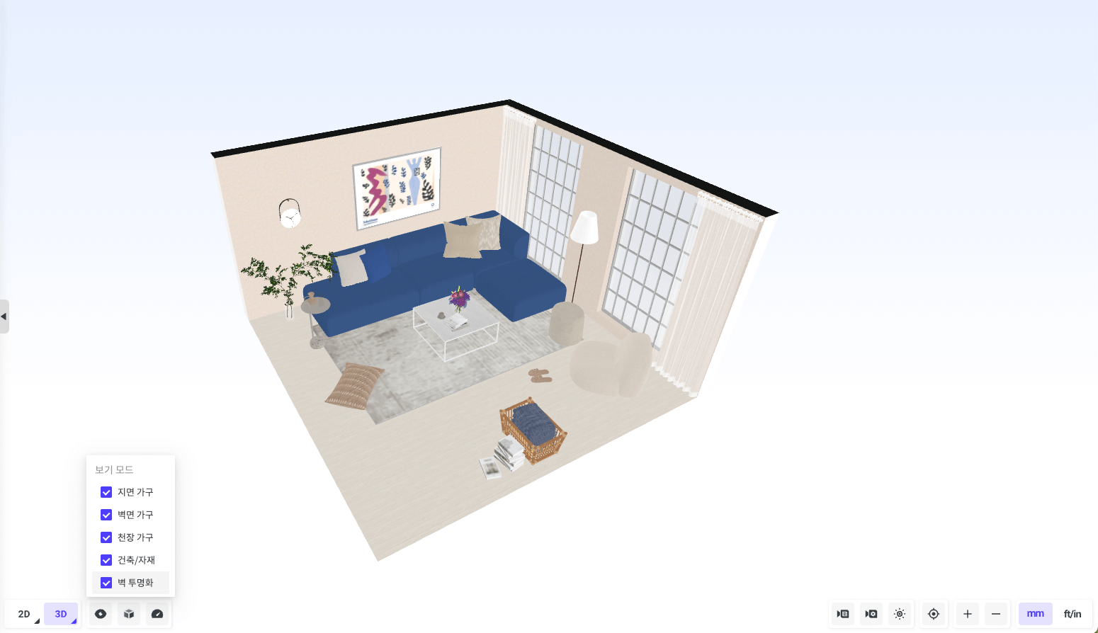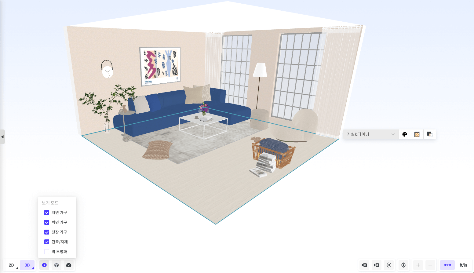 미니룸을 꾸민 후 렌더링 찍을 방향을 정합니다. (보기모드에서 [벽 투명화] 기능을 켠 상태로 둘러보면서 작업하면 편합니다.)