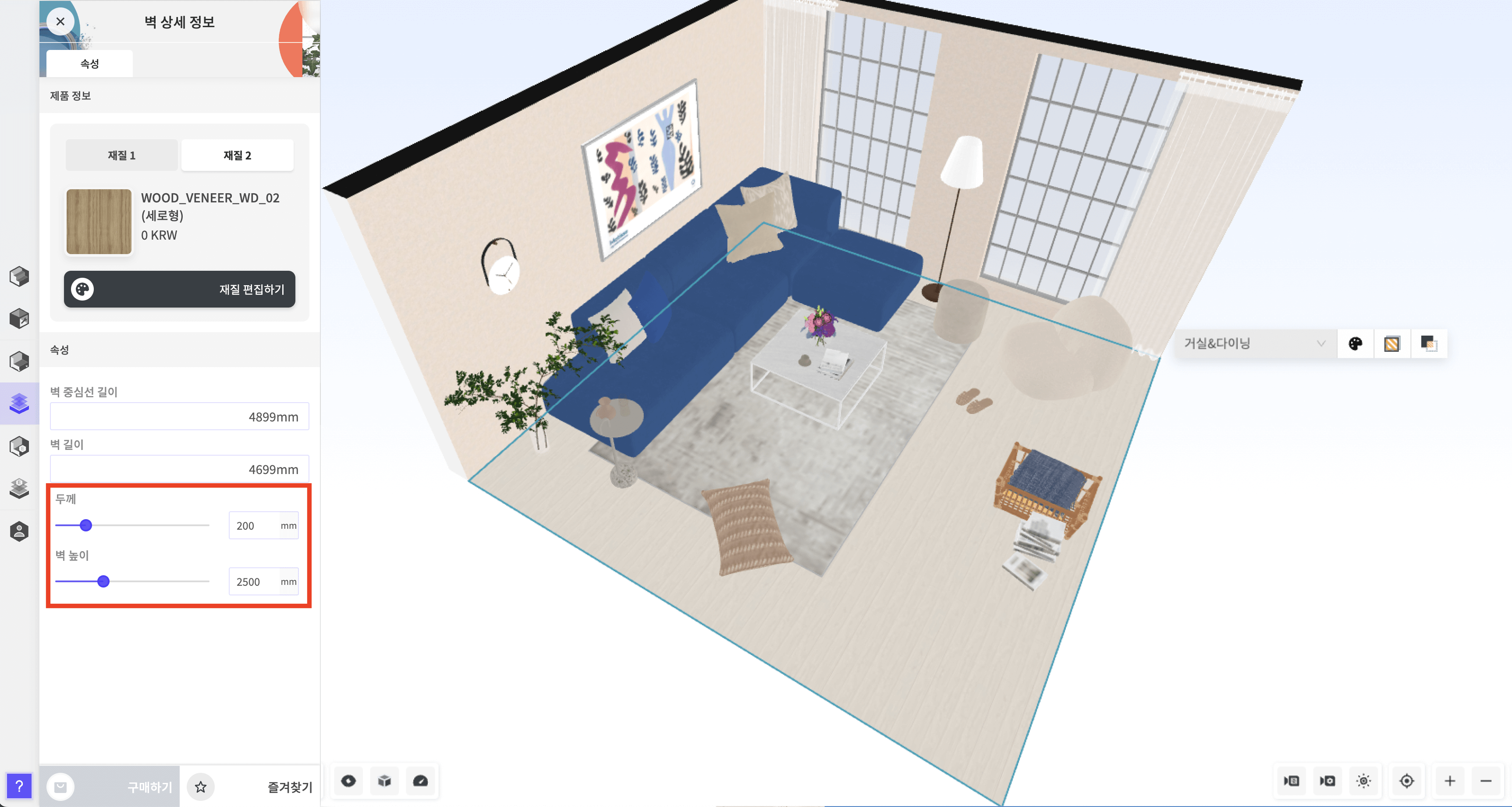 필요 없는 두 면의 벽을 안 보이게 설정해야 합니다. 벽면을 클릭 후 [벽 상세 정보]에서 [두께] 와 [벽 높이]를 최소로 줄여줍니다.