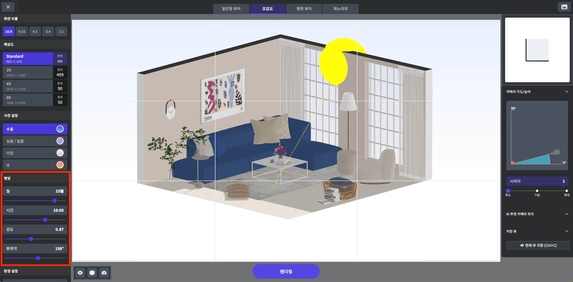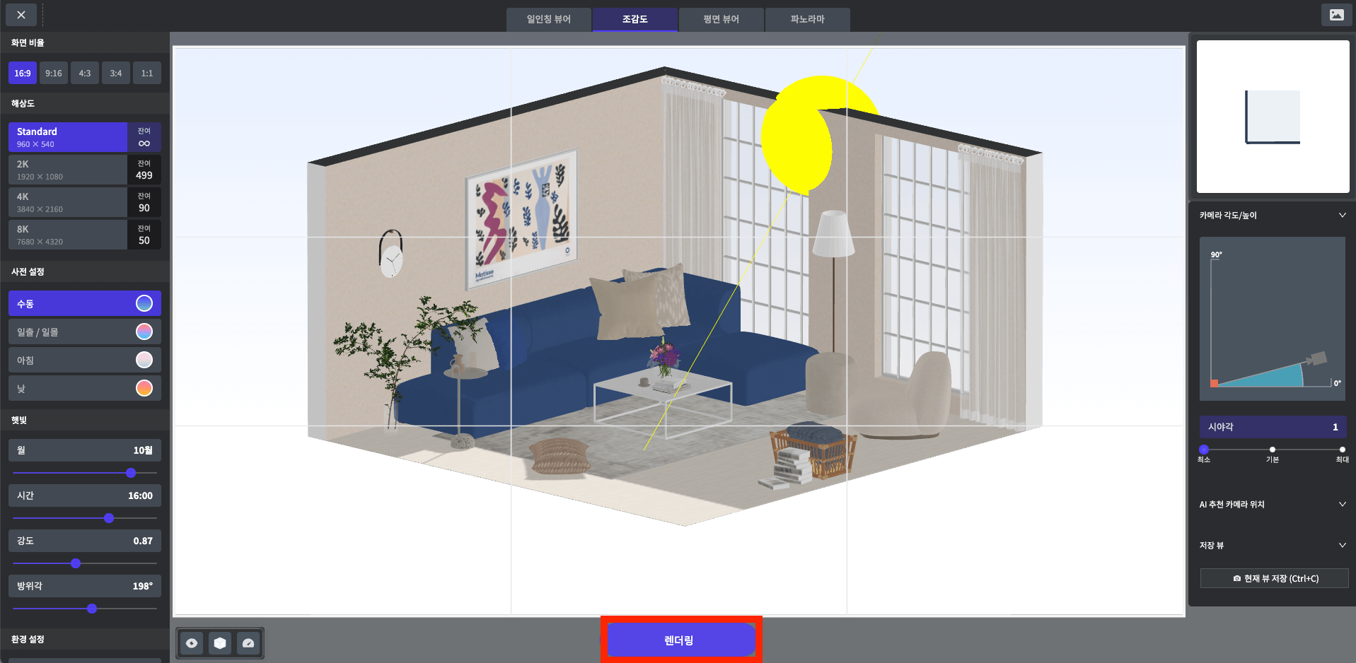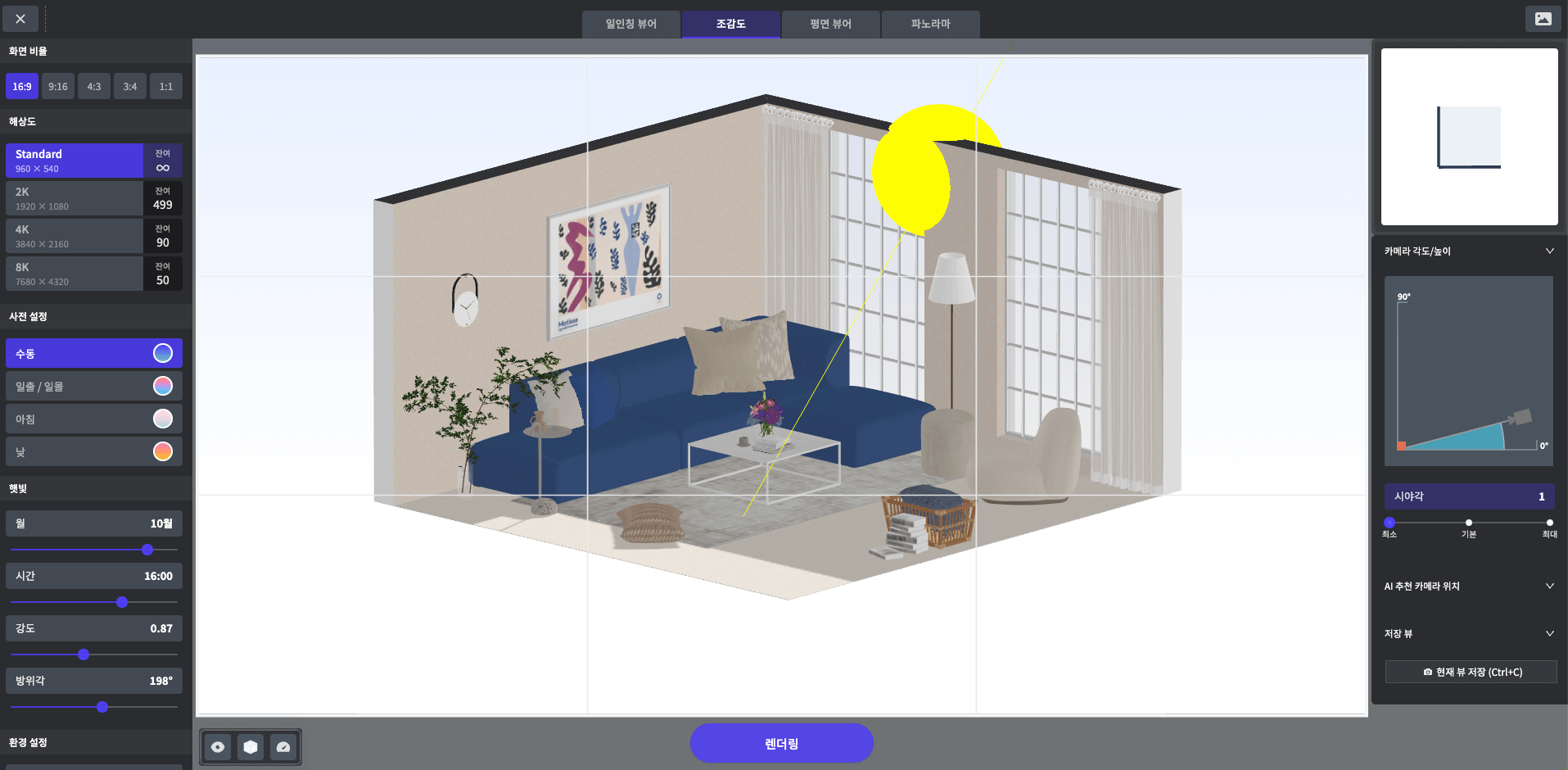 렌더 스튜디오에 진입 후 위 쪽의 [조감도] 탭을 클릭합니다.