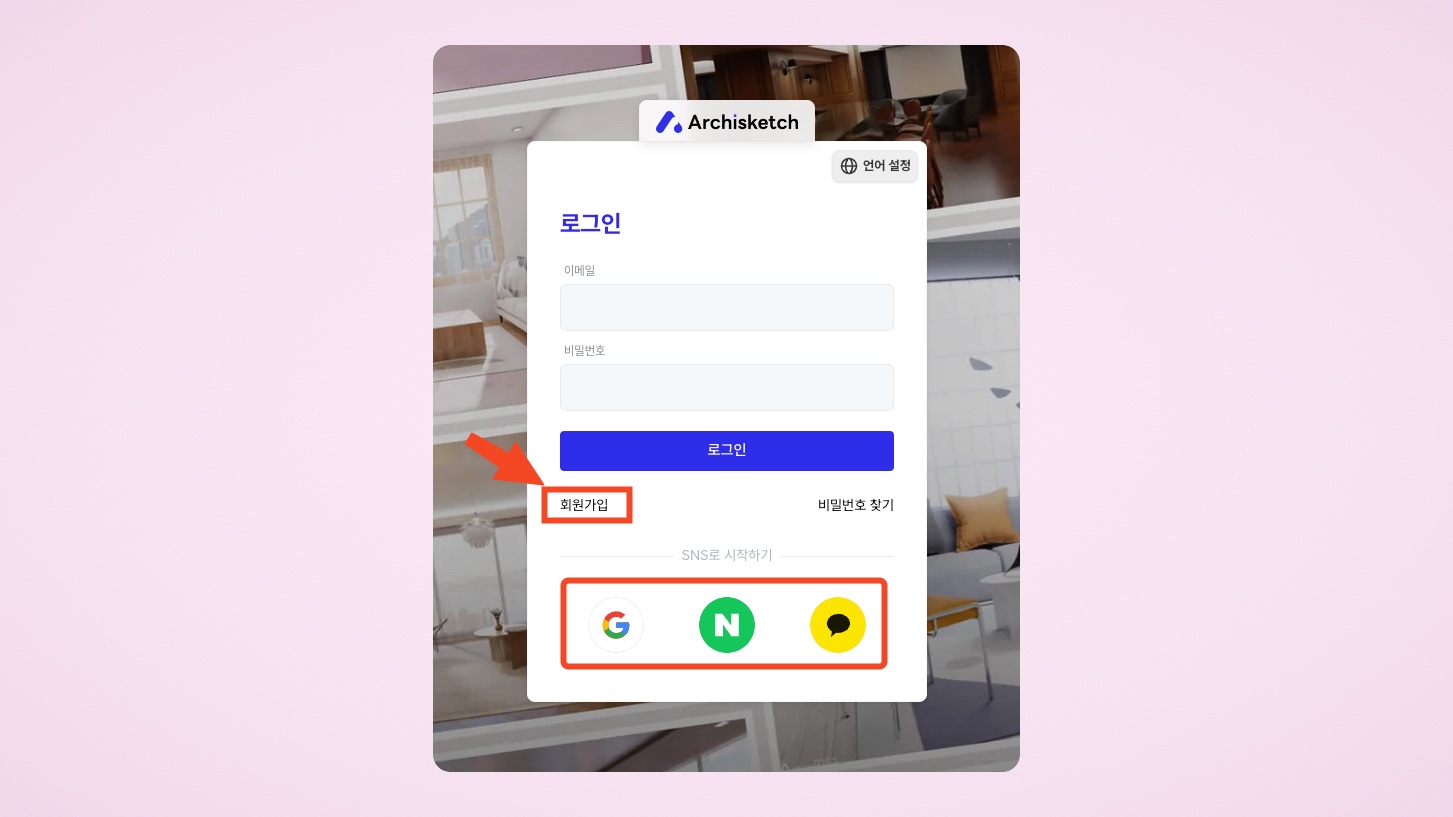 아키스케치 이용을 위해서 회원가입을 진행합니다. [회원가입] 혹은 SNS 계정을 사용하여 쉽게 가입할 수도 있어요.