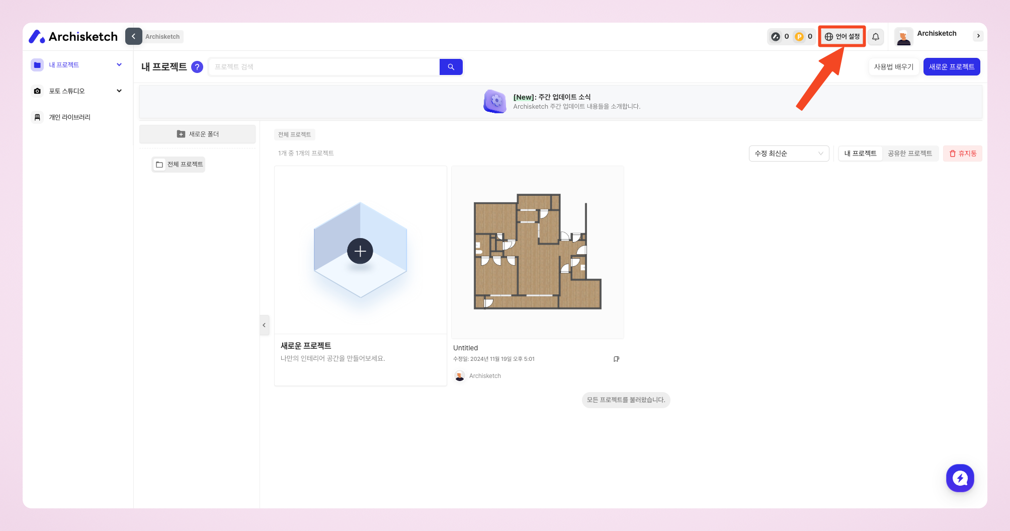 설정 경로: [아키스케치 대시보드] → [언어 설정]