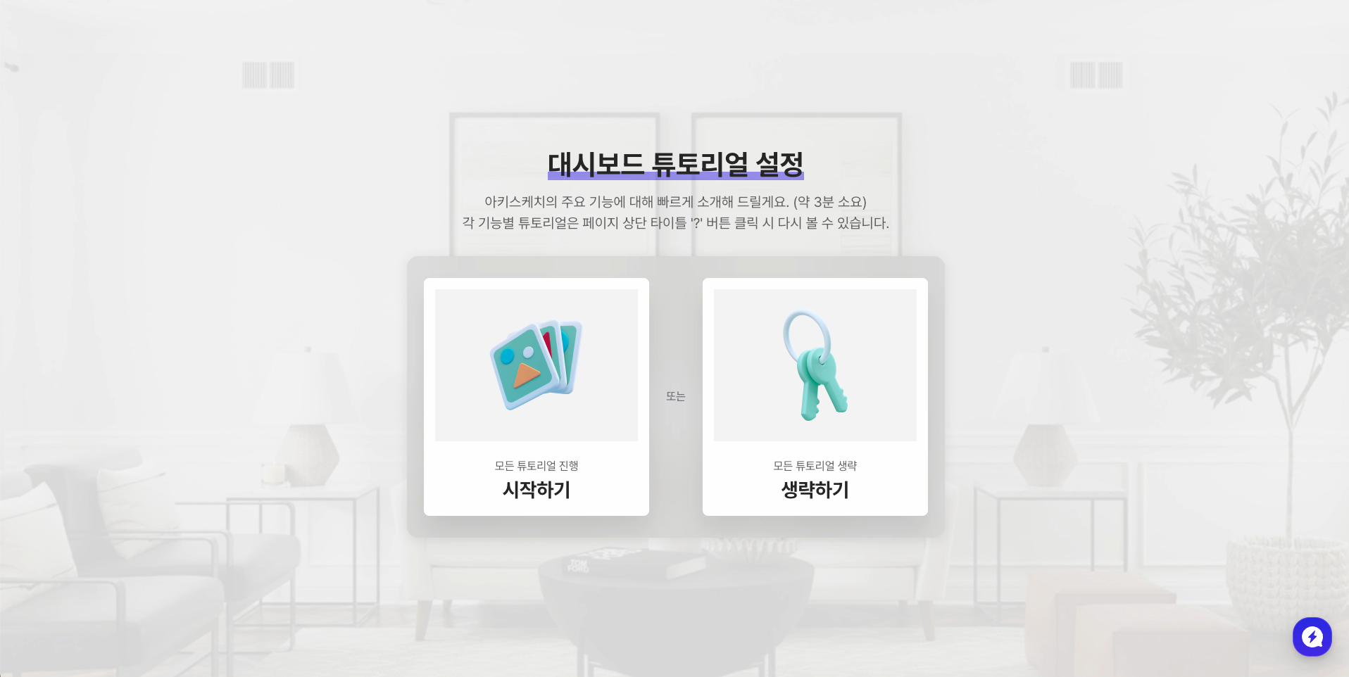 [시작하기] 버튼을 클릭하시면, 4단계의 튜토리얼을 따라가며 아키스케치 내 주요 기능을 간단히 살펴보실 수 있어요. 만약 바로 시작하고 싶으시다면, [생략하기] 버튼을 클릭해 대시보드로 바로 진입하실 수도 있습니다.