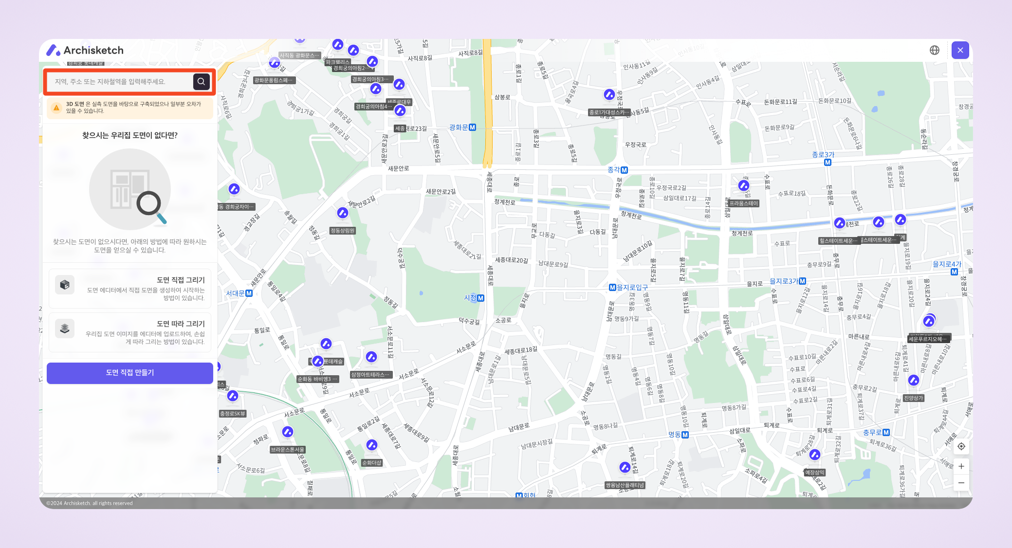 [우리집 검색하기]를 클릭하면 새로운 도면 검색 페이지로 이동합니다. 여기에서 검색창에 아파트명, 도로명 주소, 또는 지하철역 이름 등을 입력하여 원하는 정보를 찾아보세요. 지도에서 마커를 클릭하여 아파트를 선택하는 방법도 있습니다.