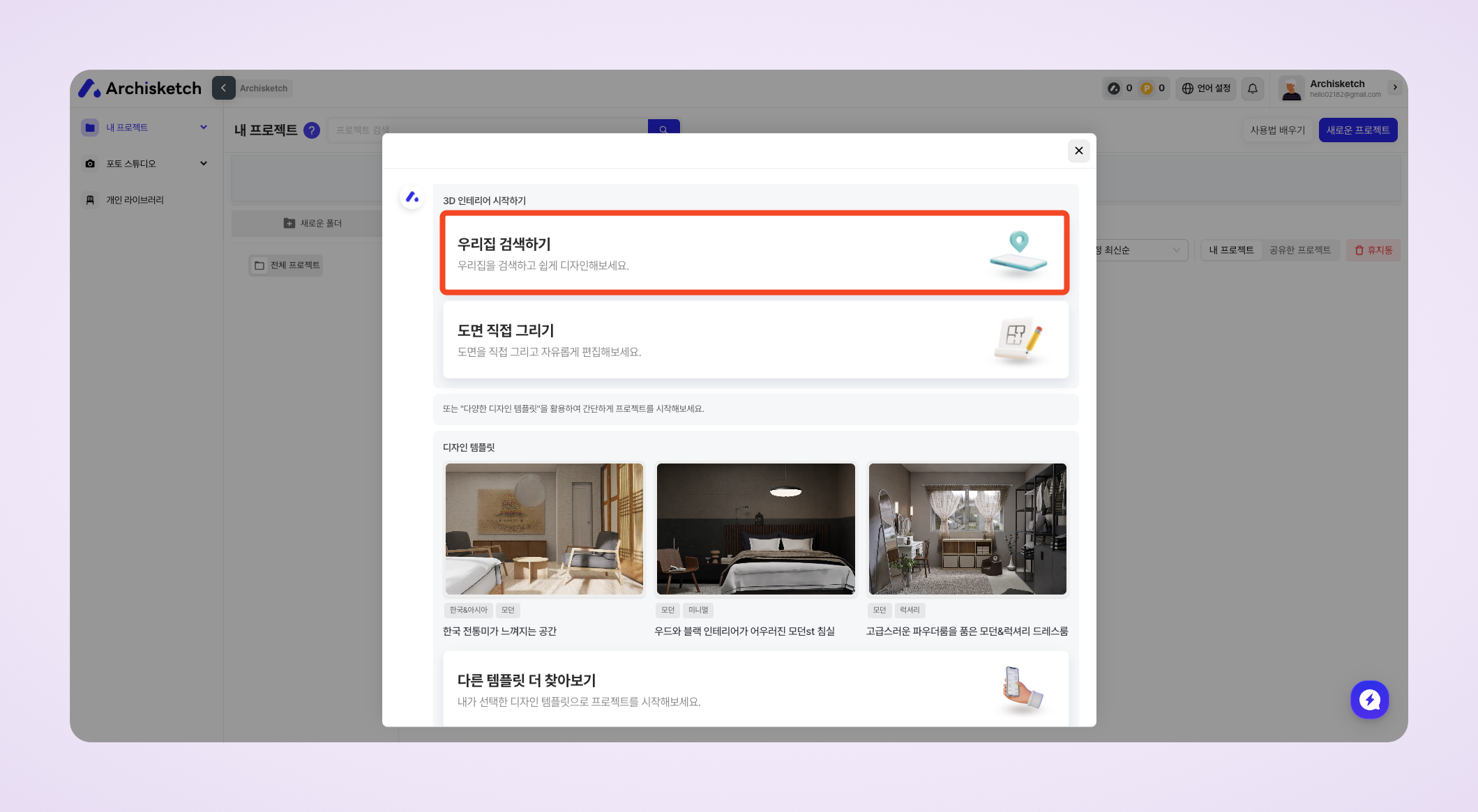 먼저, [새로운 프로젝트] 버튼을 클릭하면 2가지 옵션이 보입니다. 우리집이 아파트에 해당하는 경우, [우리집 검색하기]를 선택해 검색을 시작할 수 있습니다.