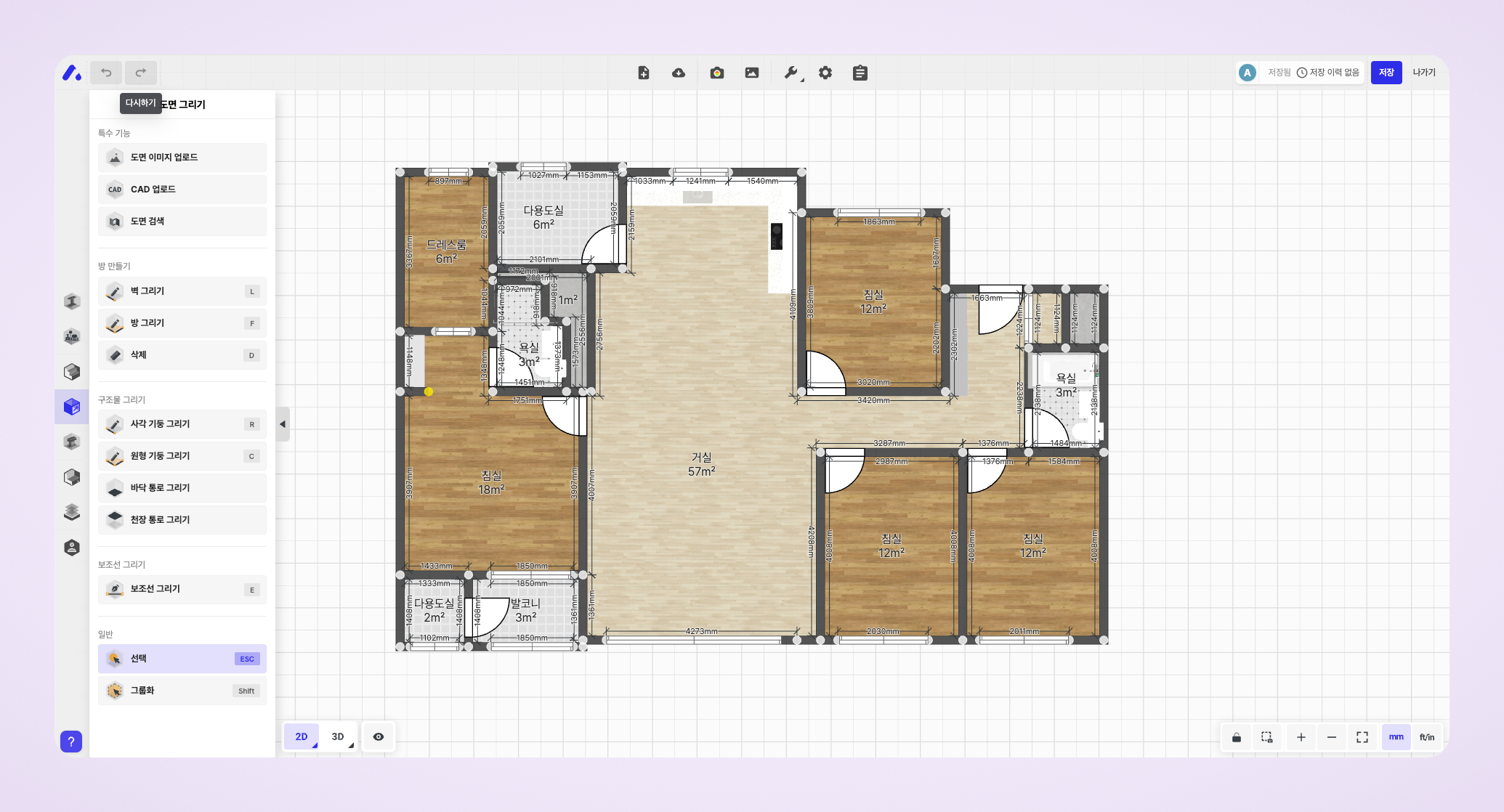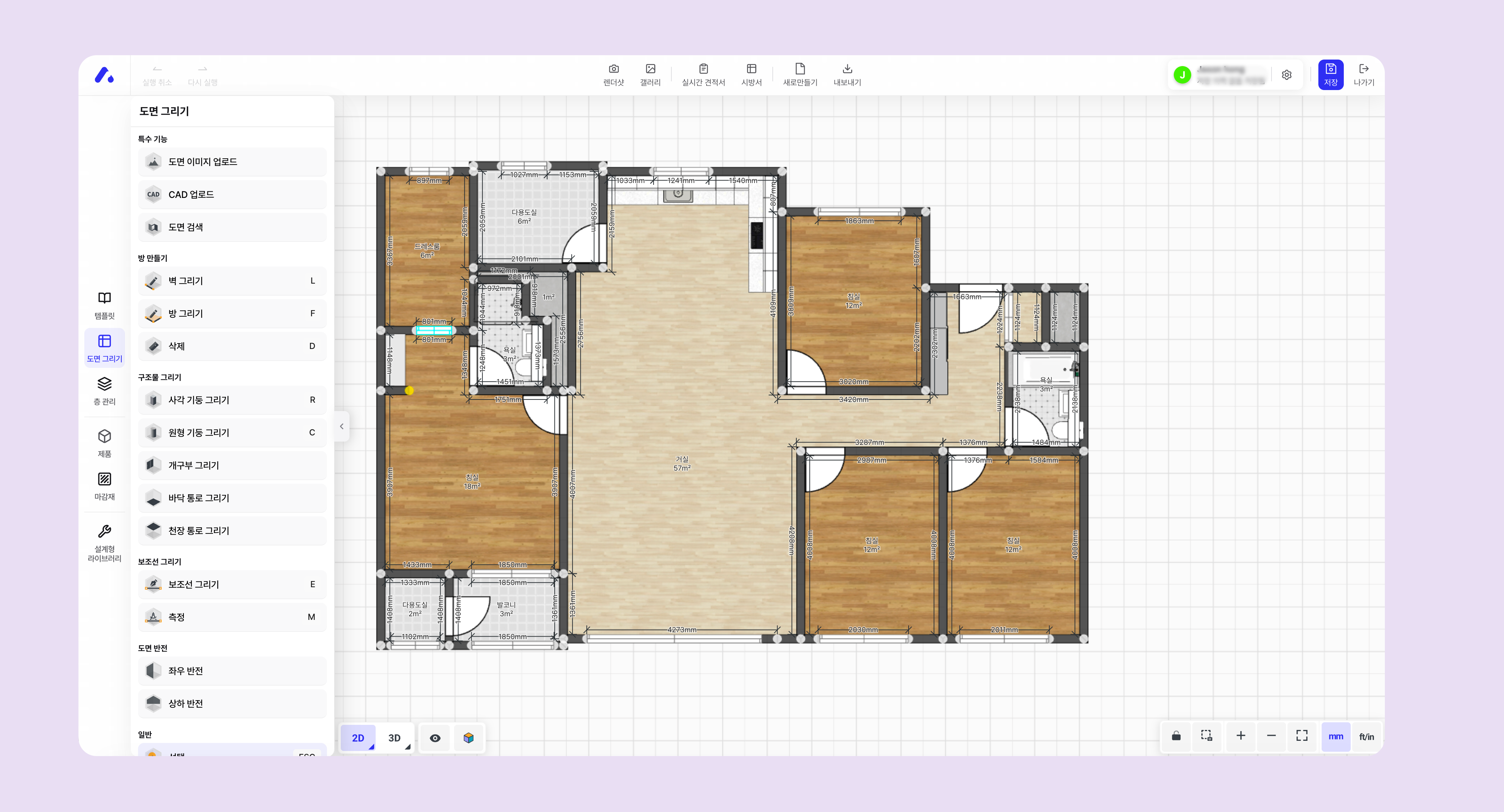 그럼, 이렇게 도면이 에디터로 불러와집니다. 에디터는 아키스케치만의 독자적인 가구 배치 및 도면 제작 툴입니다. 이 공간에서 도면을 그리고, 가구와 마감재를 배치하며, 렌더링을 찍을 수 있습니다.