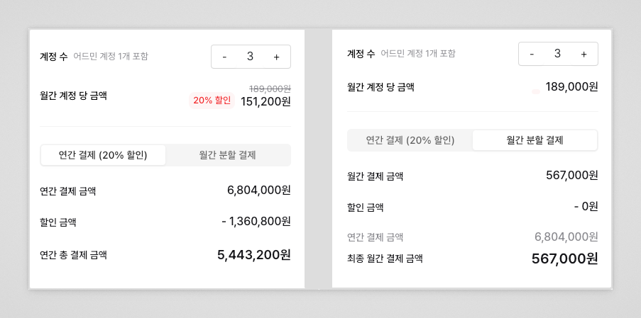 결제 후 계정 추가/삭제 가능 (삭제 시 취소 수수료 부과 가능)