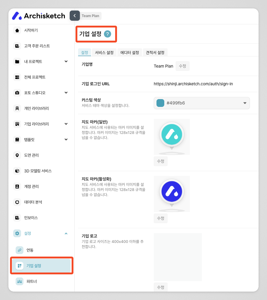 설정 → 기업 설정 탭에서 기업 맞춤 설정을 진행할 수 있습니다.자세한 설정 방법은 아래 링크에서 확인해 주세요.