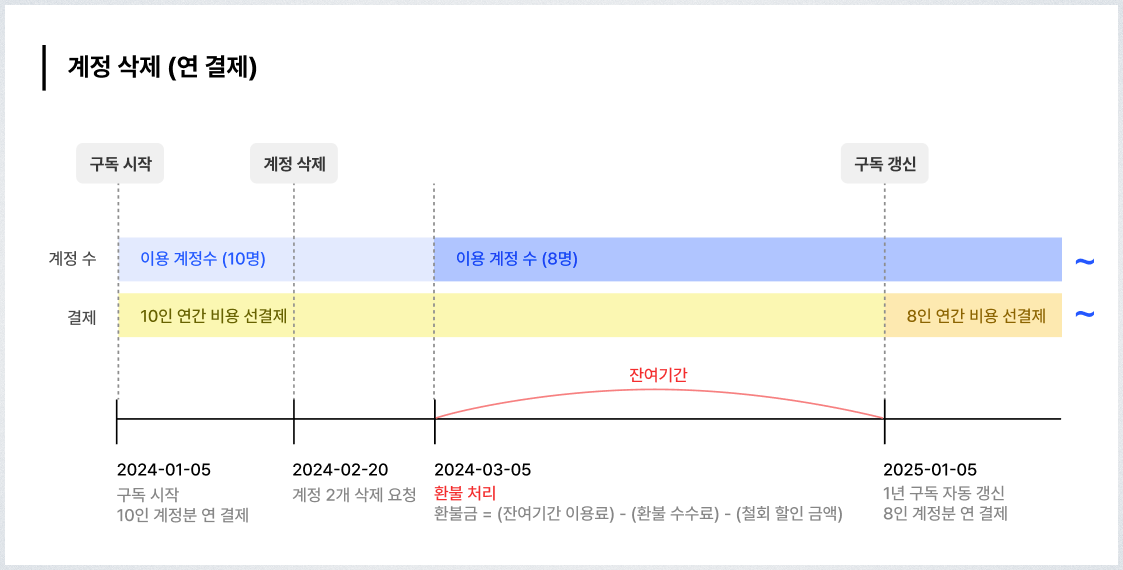 삭제된 계정의 요금은 잔여 계약 기간을 기준으로 비례 계산되어 환불됩니다.