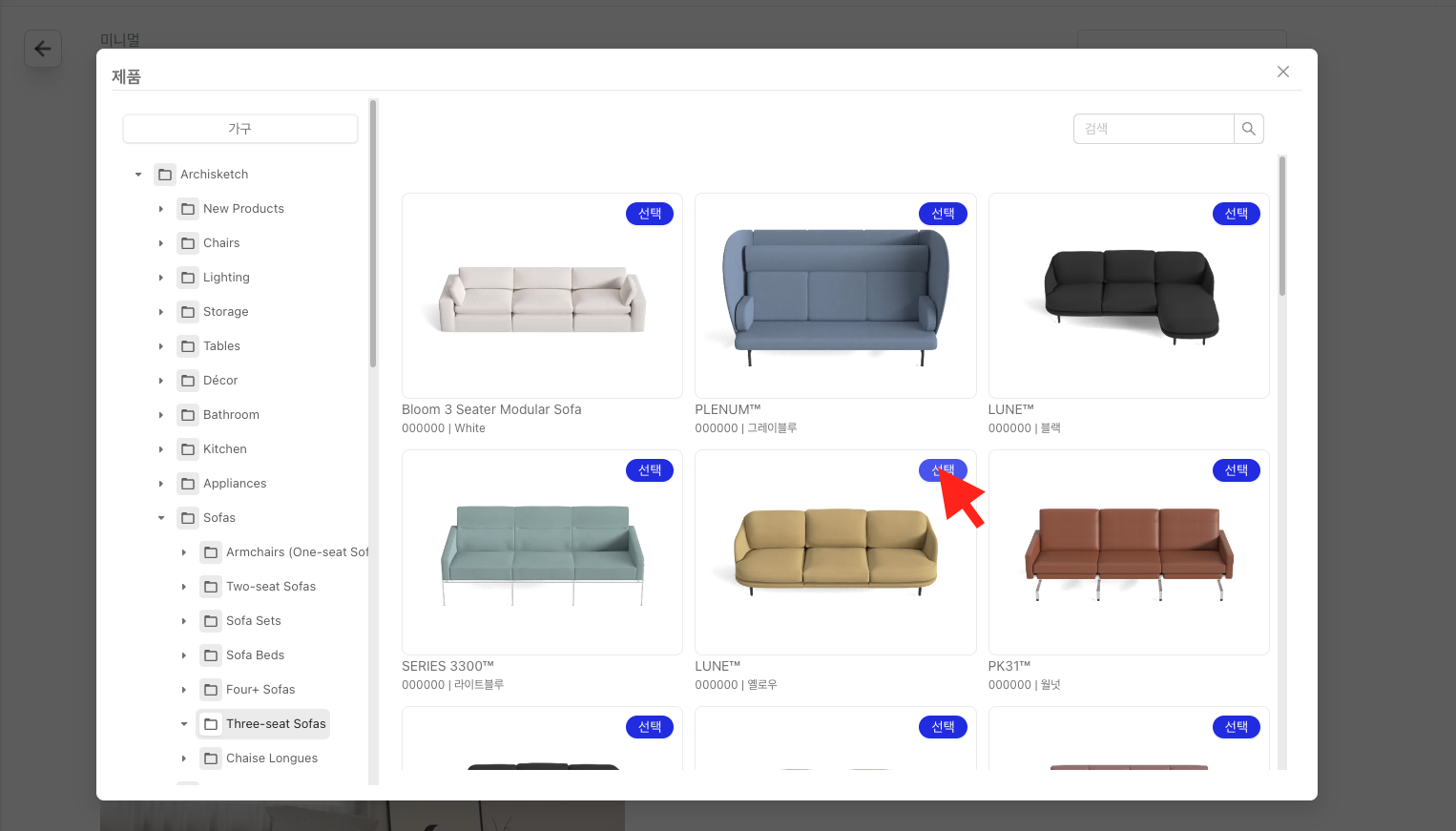 좌측의 [대 카테고리]를 클릭해 하위 카테고리를 열고, 원하는 제품을 [선택] 버튼으로 선택합니다.