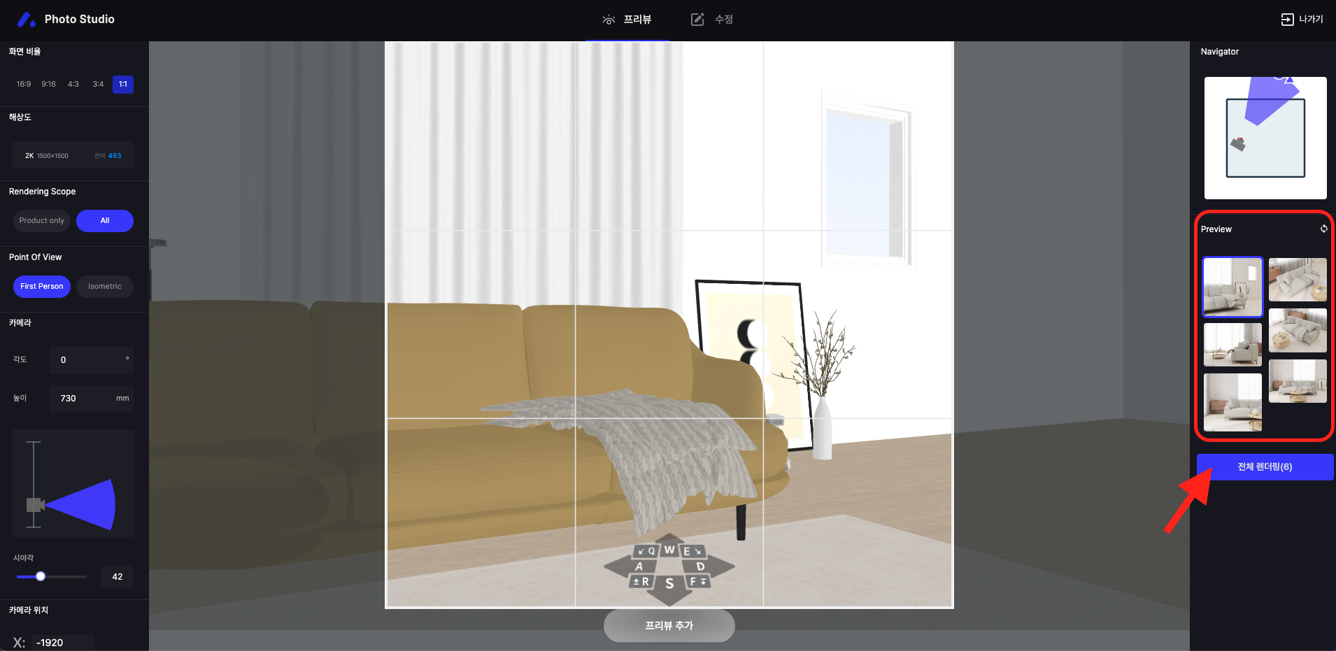 변경 없이 렌더링하려면 [전체 렌더링] 버튼을 클릭하면, 모든 Preview가 렌더링되며 포인트가 차감됩니다.